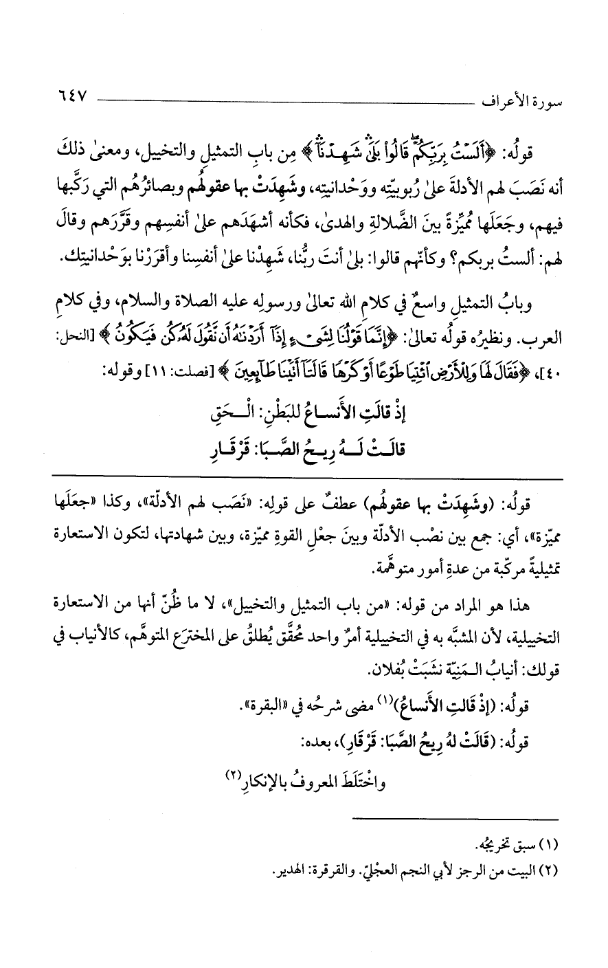 قوله: (أَلَسْتُ بِرَبِّكُمْ قالُوا بَلى شَهِدْنا) من باب التمثيل والتخييل، ومعنى ذلك أنه نصب لهم الأدلة على ربوبيته ووحدانيته، وشهدت بها عقولهم وبصائرهم التي ركبها فيهم، وجعلها مميزة بين الضلالة والهدى، فكأنه أشهدهم على أنفسهم وقررهم وقال لهم: ألست بربكم؟ وكأنهم قالوا: بلى أنت ربنا، شهدنا على أنفسنا وأقررنا بوحدانيتك.