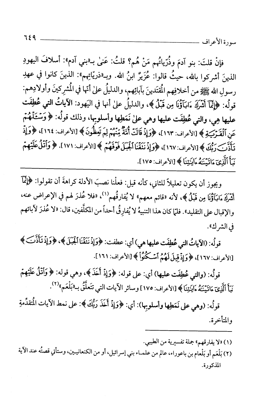 فإن قلت: بنو آدم وذرّياتهم من هم؟ قلت: عنى بـ"بني آدم": أسلاف اليهود الذين أشركوا بالله، حيث قالوا: عزير ابن الله. وبـ"ذرّياتهم": الذين كانوا في عهد رسول الله صلى الله عليه وسلم من أخلافهم المقتدين بآبائهم، والدليل على أنها في المشركين وأولادهم: قوله: (أَوْ تَقُولُوا إِنَّما أَشْرَكَ آباؤُنا مِنْ قَبْلُ)، والدليل على أنها في اليهود: الآيات التي عُطفت عليها هي، والتي عطفت عليها وهي على نمطها وأسلوبها، وذلك قوله: (وَسْئَلْهُمْ عَنِ الْقَرْيَةِ) [الأعراف: 163]، (وَإِذْ قالَتْ أُمَّةٌ مِنْهُمْ لِمَ تَعِظُونَ) [الأعراف: 164]، (وَإِذْ تَأَذَّنَ رَبُّكَ) [الأعراف: 167]، (وَإِذْ نَتَقْنَا الْجَبَلَ فَوْقَهُمْ) [الأعراف: 171]. (وَاتْلُ عَلَيْهِمْ نَبَأَ الَّذِي آتَيْناهُ آياتِنا) [الأعراف: 175].