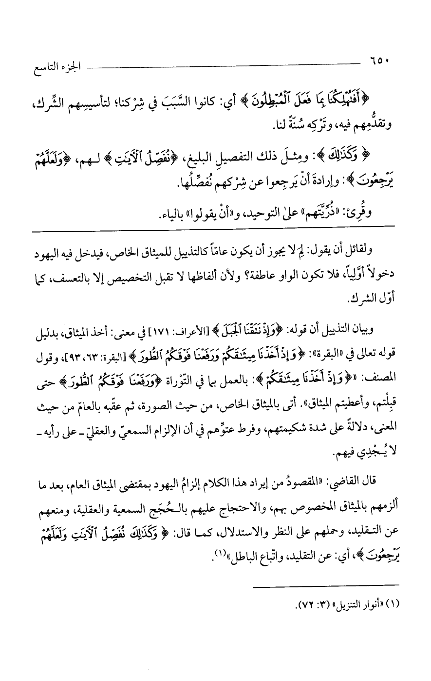قال القاضي: "المقصود من إيراد هذا الكلام إلزام اليهود بمقتضى الميثاق العام، بعد ما ألزمهم بالميثاق المخصوص بهم، والاحتجاج عليهم بالحجج السمعية والعقلية، ومنعهم عن التقليد، وحملهم على النظر والاستدلال، كما قال: (وكَذَلِكَ نُفَصِّلُ الآيَاتِ ولَعَلَّهُمْ يَرْجِعُونَ)، أي: عن التقليد، واتباع الباطل".
