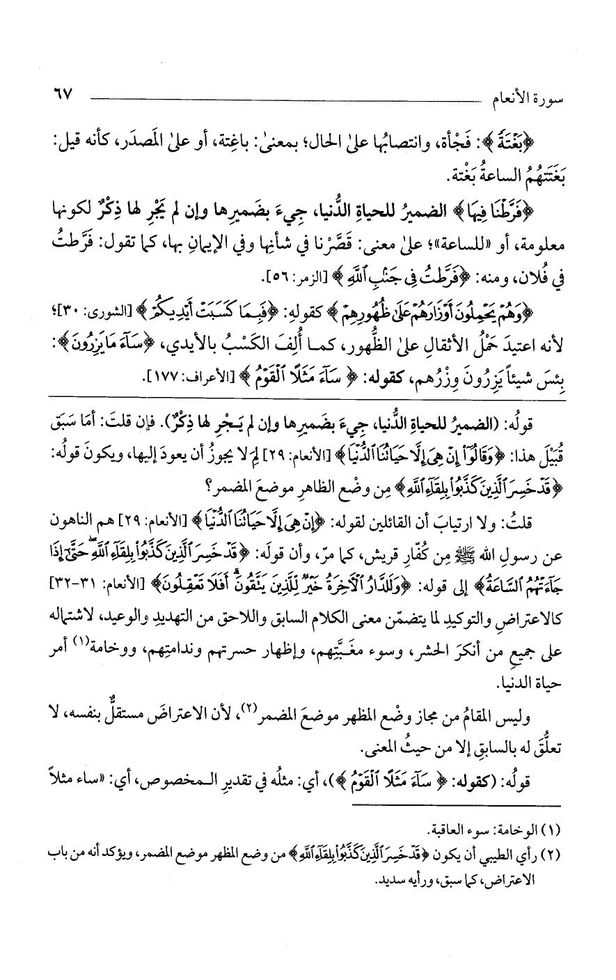 قوله: (الضمير للحياة الدنيا، جيء بضميرها وإن لم يجر لها ذكر). فإن قلت: أما سبق قبيل هذا: {وقَالُوا إنْ هِيَ إلاَّ حَيَاتُنَا الدُّنْيَا {[الأنعام: 29] لم لا يجوز أن يعود إليها، ويكون قوله: {قَدْ خَسِرَ الَّذِينَ كَذَّبُوا بِلِقَاءِ اللَّهِ {من وضع الظاهر موضع المضمر؟