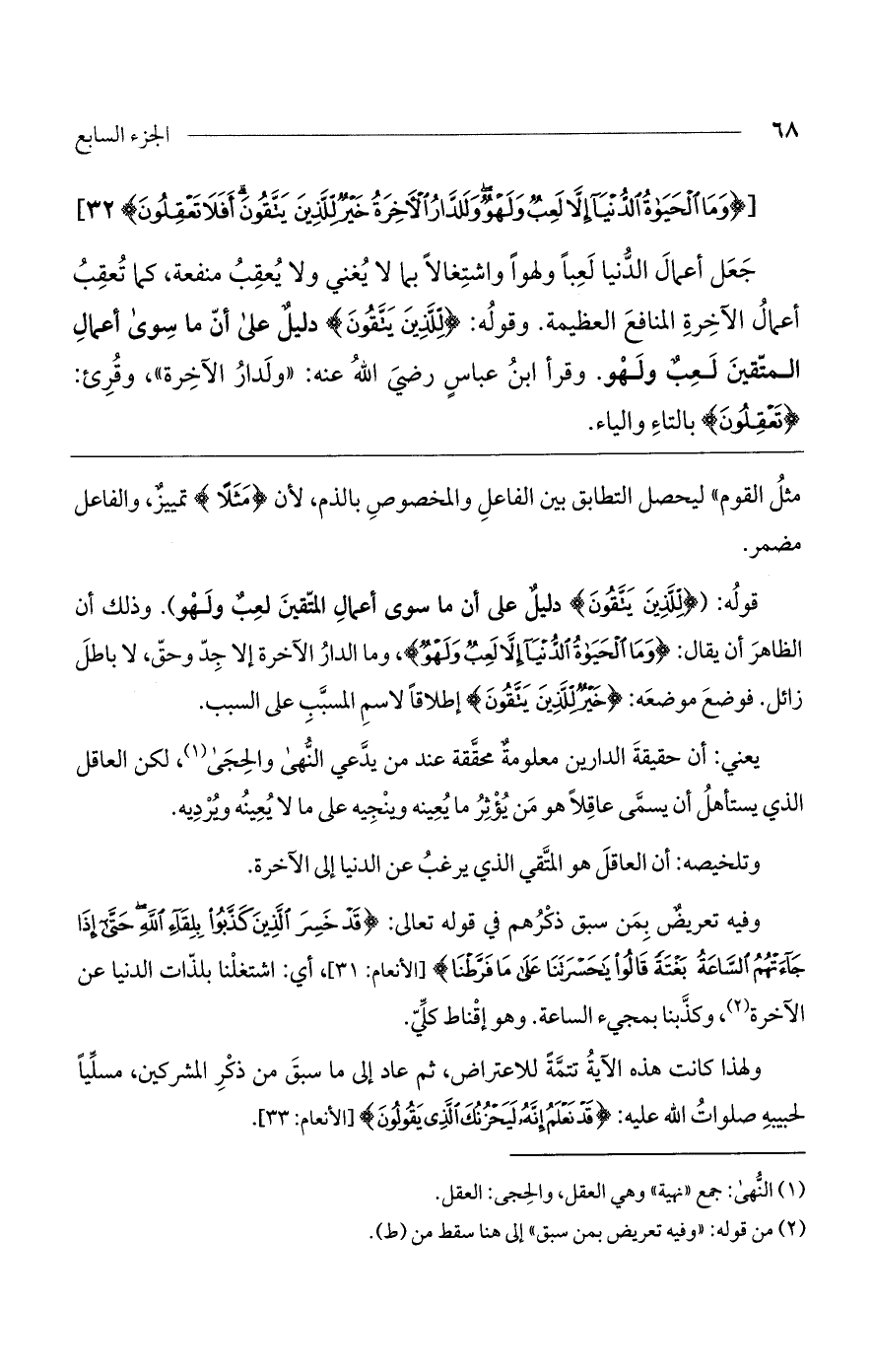 جعل أعمال الدنيا لعباً ولهواً واشتغالا بما لا يعنى ولا يعقب منفعة، كما تعقب أعمال الآخرة المنافع العظيمة. وقوله: (لِلَّذِينَ يَتَّقُونَ) دليلٌ على أن ما عدا أعمال المتقين لعب ولهو. وقرأ ابن عباسٍ رضي الله عنه: "ولدار الآخرة"، وقرئ: (تعقلون) بالتاء والياء.