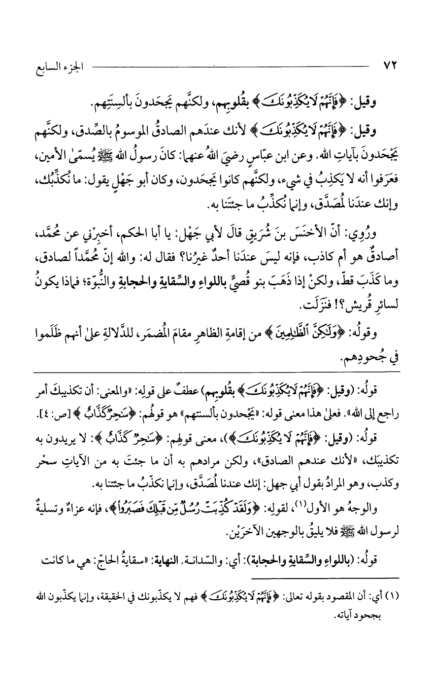 قوله: (وقيل: {فَإنَّهُمْ لا يُكَذِّبُونَكَ {، معنى قولهم: {سَاحِرٌ كَذَّابٌ {: لا يريدون به تكذيبك، "لأنك عندهم الصادق"، ولكن مرادهم به أن ما جئت به من الآيات سحر وكذب، وهو المراد بقول أبي جهل: إنك عندنا لمصدق، وإنما نكذب ما جئتنا به.