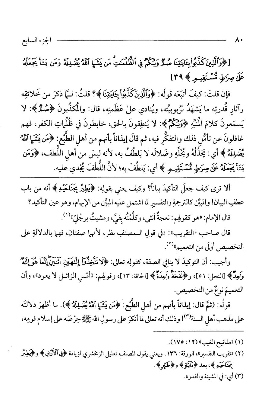 ألا ترى كيف جعل التأكيد بياناً؟ وكيف يعني بقوله: {يَطِيرُ بِجَنَاحَيْهِ {أنه من باب عطف البيان! والمبين كالترجمة والتفسير لما اشتمل عليه المبين من الإبهام، وهو عين التأكيد؟
