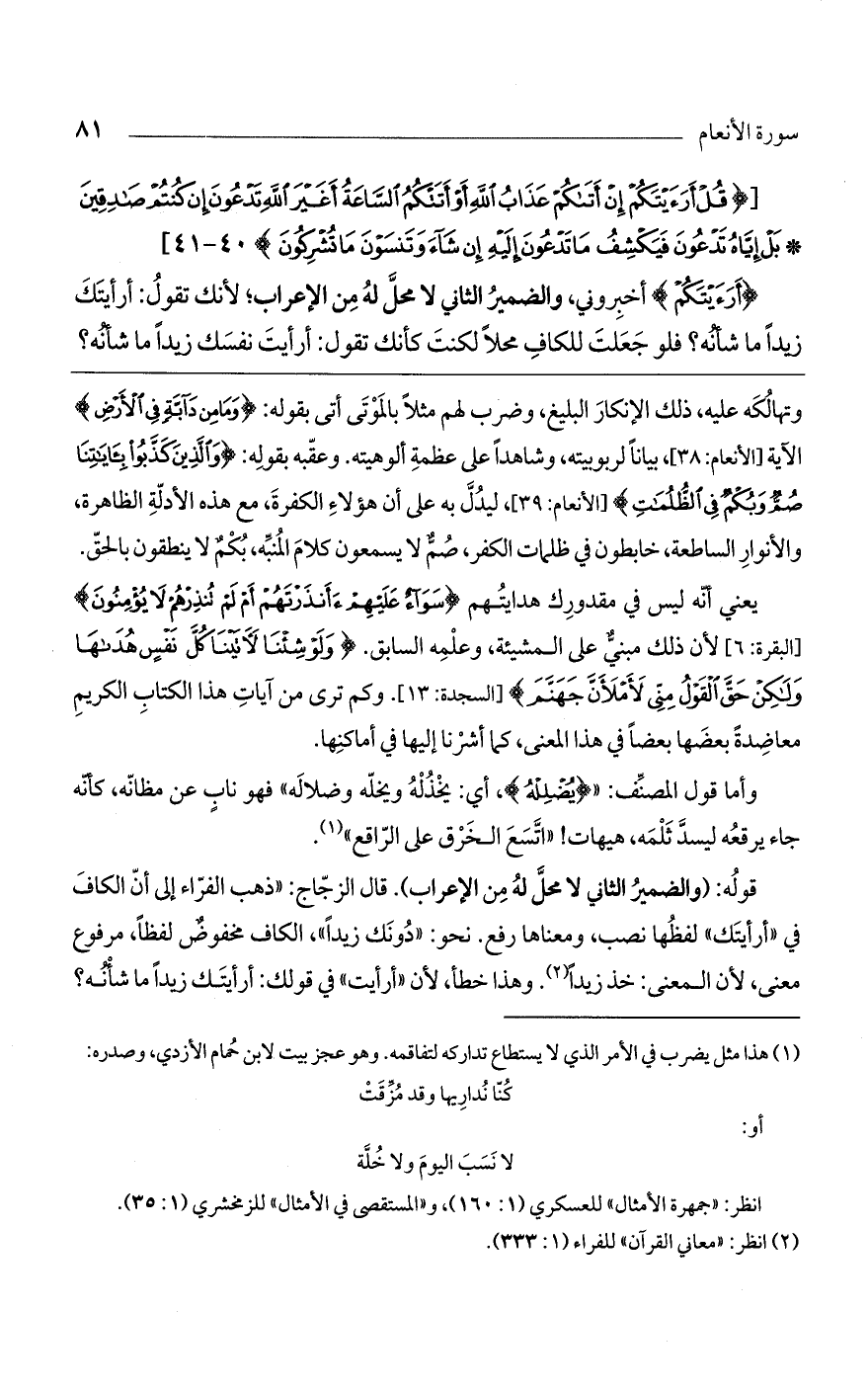 قوله: (والضمير الثاني لا محل له من الإعراب). قال الزجاج: "ذهب الفراء إلى أن الكاف في "أرأيتك" لفظها نصب، ومعناها رفع. نحو: "دونك زيداً"، الكاف مخفوض لفظاً، مرفوع معنى، لأن المعنى: خذ زيداً. وهذا خطأ، لأن "أرأيت" في قولك: أرأيتك زيداً ما شأنه؟