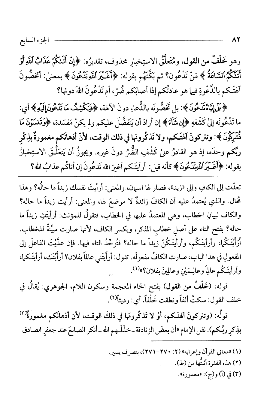 قوله: (وتتركون آلهتكم، أو لا تذكرونها في ذلك الوقت، لأن أذهانكم مغمورة بذكر ربكم). نقل الإمام "أن بعض الزنادقة - خذلهم الله - أنكر الصانع عند جعفر الصادق