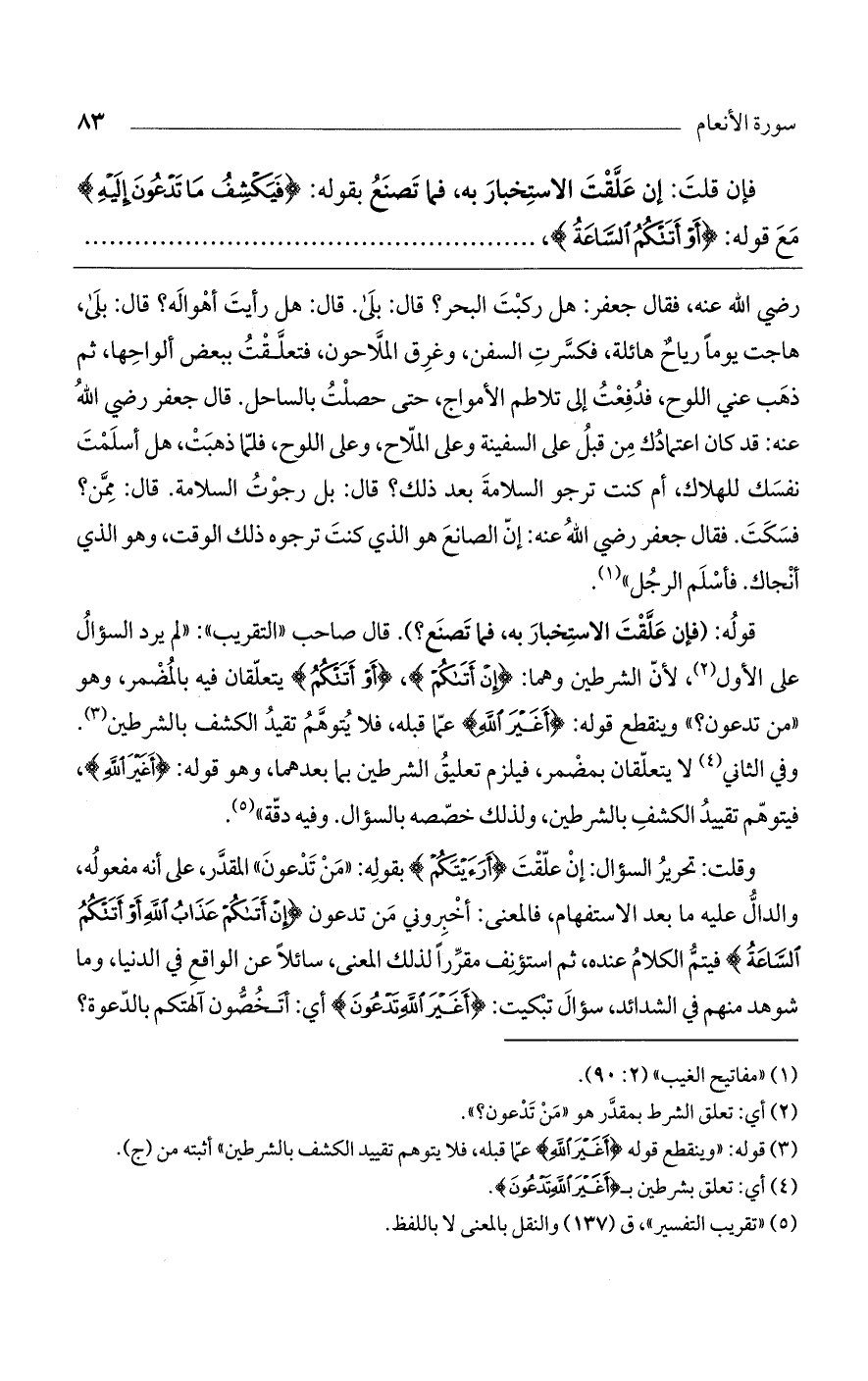 قوله: (فإن علقت الاستخبار به، فما تصنع؟ ). قال صاحب "التقريب": "لم يرد السؤال على الأول، لأن الشرطين وهما: {إنْ أَتَاكُمْ {، {أَوْ أَتَتْكُمُ {يتعلقان فيه بالمضمر، وهو "من تدعون؟ " وينقطع قوله: {أَغَيْرَ اللَّهِ {عما قبله، فلا يتوهم تقيد الكشف بالشرطين. وفي الثاني لا يتعلقان بمضمر، فيلزم تعليق الشرطين بما بعدهما، وهو قوله: {أَغَيْرَ اللَّهِ {، فيتوهم تقييد الكشف بالشرطين، ولذلك خصصه بالسؤال. وفيه دقة".