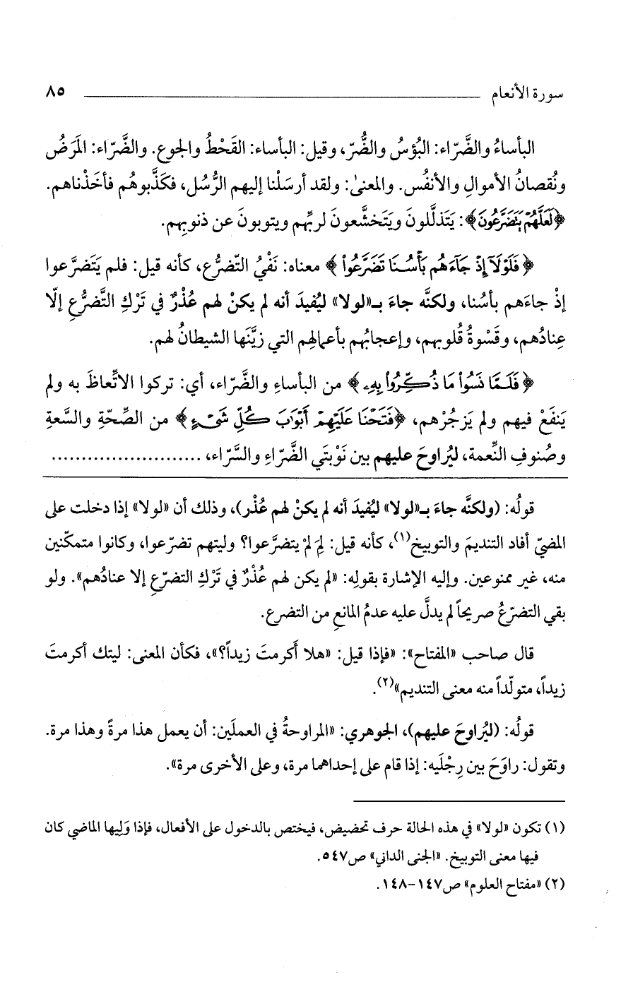 (فَلَوْلا إِذْ جاءَهُمْ بَاسُنا تَضَرَّعُوا) معناه: نفي التضرع، كأنه قيل: فلم يتضرعوا إذ جاءهم بأسنا. ولكنه جاء بـ"لولا" ليفيد أنه لم يكن لهم عذر في ترك التضرع إلا عنادهم، وقسوة قلوبهم، وإعجابهم بأعمالهم التي زينها الشيطان لهم.