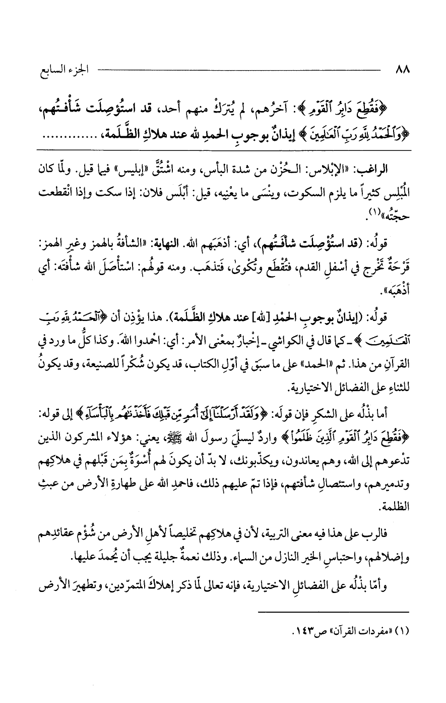 قوله: (إيذان بوجوب الحمد [الله] عند هلاك الظلمة). هذا يؤذن أن {والْحَمْدُ لِلَّهِ رَبِّ العَالَمِينَ {- كما قال في الكواشي - إخبار بمعنى الأمر: أي: احمدوا الله. وكذا كل ما ورد في القرآن من هذا. ثم "الحمد" على ما سبق في أول الكتاب، قد يكون شكراً للصنيعة، وقد يكون للثناء على الفضائل الاختيارية.