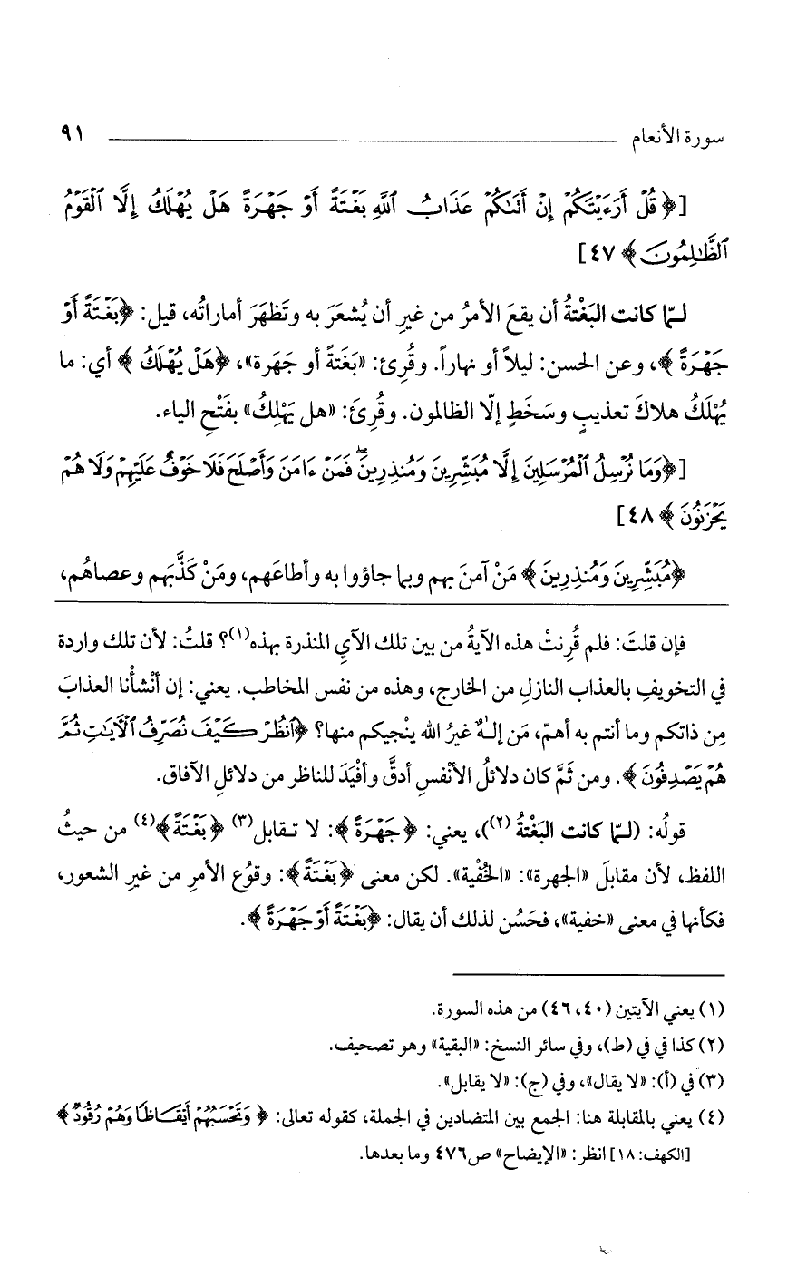 قوله: (لما كانت البغتة)، يعني: {جَهْرَةً {: لا تقابل {بَغْتَةً {من حيث اللفظ، لأن مقابل "الجهرة": "الخفية". لكن معنى {بَغْتَةً {: وقوع الأمر من غير الشعور، فكأنها في معنى "خفية"، فحسن لذلك أن يقال: {بغتةً أو جهرةً {.