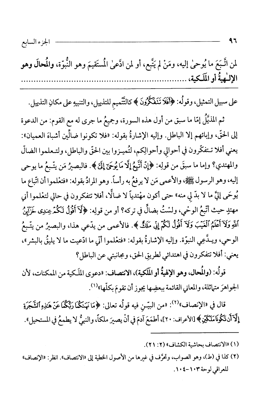 ثم المذيل إما ما سبق من أول هذه السورة، وجميع ما جرى له مع القوم: من الدعوة إلى الحق، وإبائهم إلا الباطل. وإليه الإشارة بقوله: "فلا تكونوا ضالين أشباه العميان": يعني أفلا تتفكرون في أحوالي وأحوالكم، لتميزوا بين الحق والباطل، ولتعلموا الضال والمهتدي؟ وإما ما سبق من قوله: {إنْ أَتَّبِعُ إلاَّ مَا يُوحَى إلَيَّ {. فالبصير من يتبع ما يوحي إليه، وهو الرسول صلى الله عليه وسلم، والأعمى من لا يرفع به رأساً. وهو المراد بقوله: "فتعلموا أن أتباع ما يوحي إلى ما لابد لي منه" حتى أكون مهتدياً لا ضالا، أفلا تتفكرون في حالي لتعلموا أني مهتدٍ حيث أتبع الوحي، ولست بضال في تركه؟ أو من قوله: {لاَّ أَقُولُ لَكُمْ عِندِي خَزَائِنُ اللَّهِ ولا أَعْلَمُ الغَيْبَ ولا أَقُولُ لَكُمْ إنِّي مَلَكٌ {. فالأعمى من يدعي هذا، والبصير من يتبع الوحي، ويدعى النبوة. وإليه الإشارة بقوله: "فتعلموا أني ما ادعيت ما لا يليق بالبشر"، يعني: أفلا تتفكرون في اهتدائي لطريق الحق، ومجانبتي عن الباطل؟