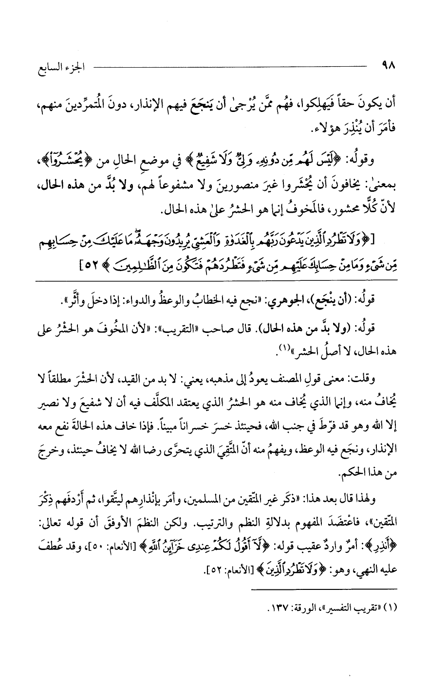 ولهذا قال بعد هذا: "ذكر غير المتقين من المسلمين، وأمر بإنذارهم ليتقوا، ثم أردفهم ذكر المتقين)، فاعتضد المفهوم بدلالة النظم والترتيب. ولكن النظم الأوفق أن قوله تعالى: {أَنذِرِ {: أمر وارد عقيب قوله: {ولا أَقُولُ لَكُمْ عِندِي خَزَائِنُ اللَّهِ {[الأنعام: 50]، وقد عطف عليه النهي، وهو: {ولا تَطْرُدِ الَّذِينَ {[الأنعام: 52].