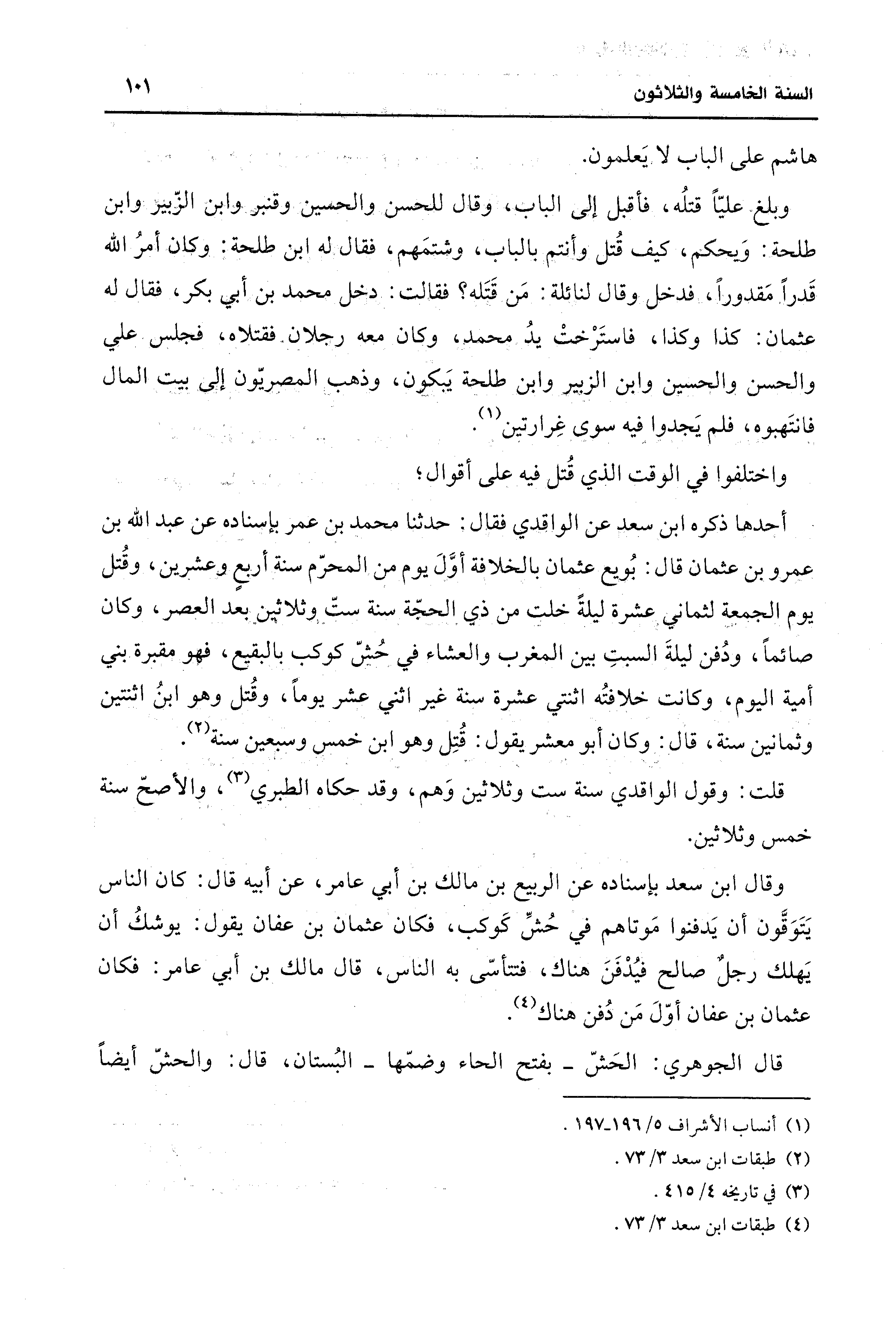 أحدها ذكره ابن سعد عن الواقدي فقال: حدثنا محمد بن عمر بإسناده عن عبد الله بن عمرو بن عثمان قال: بُويع عثمان بالخلافة أوَّلَ يوم من المحرّم سنة أربعٍ وعشرين، وقُتل يوم الجمعة لثماني عشرة ليلةً خلت من ذي الحجّة سنة ستّ وثلاثين بعد العصر، وكان صائمًا، ودُفن ليلةَ السبتِ بين المغرب والعشاء في حُشّ كوكب بالبقيع، فهو مقبرة بني أمية اليوم، وكانت خلافتُه اثنتي عشرة سنة غير اثني عشر يومًا، وقُتل وهو ابنُ اثنتين وثمانين سنة، قال: وكان أبو معشر يقول: قُتِل وهو ابن خمس وسبعين سنة (¬2).