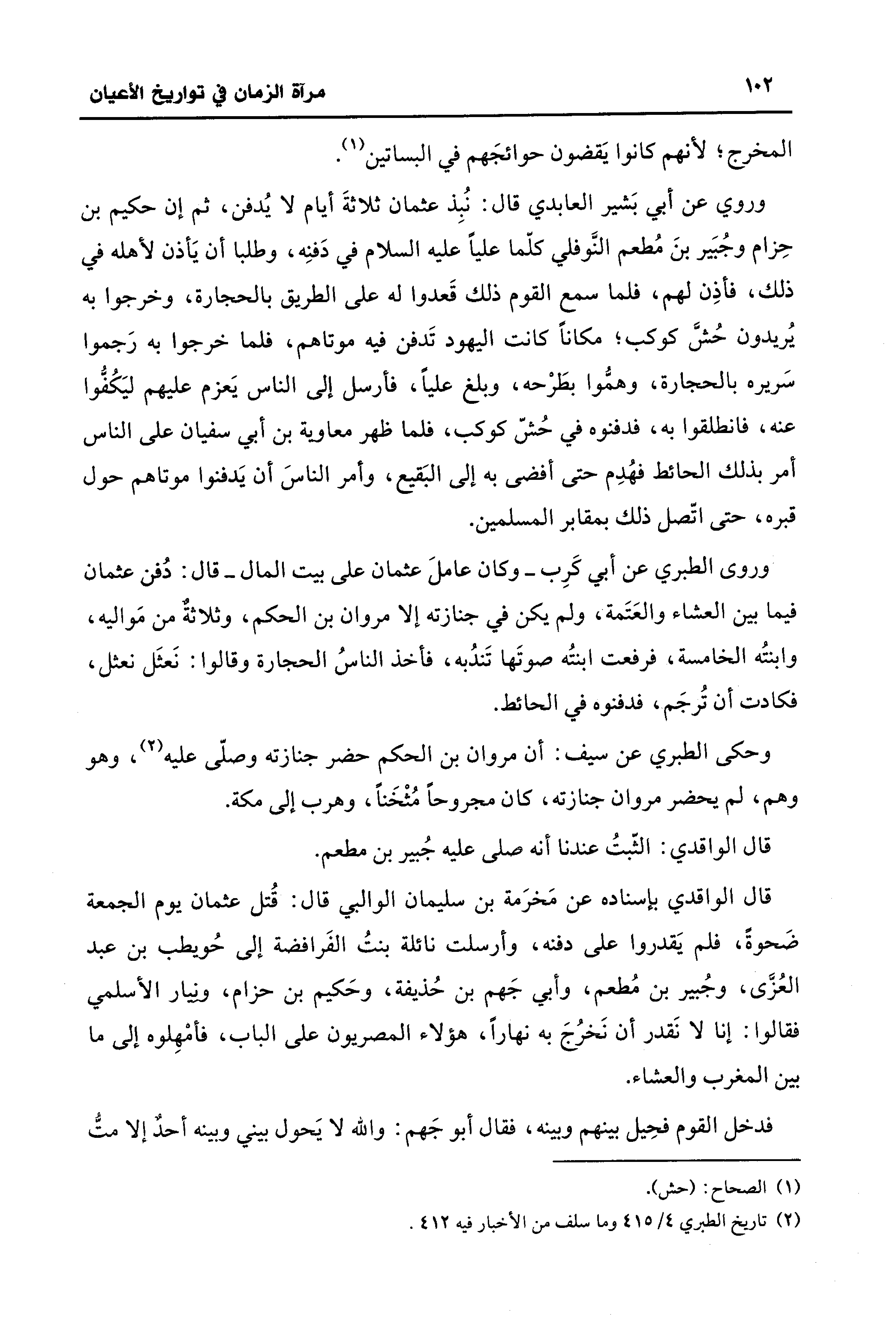 وروي عن أبي بَشير العابدي قال: نُبِذ عثمان ثلاثةَ أيام لا يُدفن، ثم إن حكيم بن حِزام وجُبَير بنَ مُطعم النَّوفلي كلّما عليًّا - عليه السلام - في دَفنِه، وطلبا أن يَأذن لأهله في ذلك، فأذِن لهم، فلما سمع القوم ذلك قَعدوا له على الطريق بالحجارة، وخرجوا به يُريدون حُشَّ كوكب؛ مكانًا كانت اليهود تَدفن فيه موتاهم، فلما خرجوا به رَجموا سَريره بالحجارة، وهمُّوا بطَرْحه، وبلغ عليًّا، فأرسل إلى الناس يَعزم عليهم ليَكُفُّوا عنه، فانطلقوا به، فدفنوه في حُشّ كوكب، فلما ظهر معاوية بن أبي سفيان على الناس أمر بذلك الحائط فهُدِم حتى أفضى به إلى البَقيع، وأمر الناسَ أن يَدفنوا موتاهم حول قبره، حتى اتّصل ذلك بمقابر المسلمين.