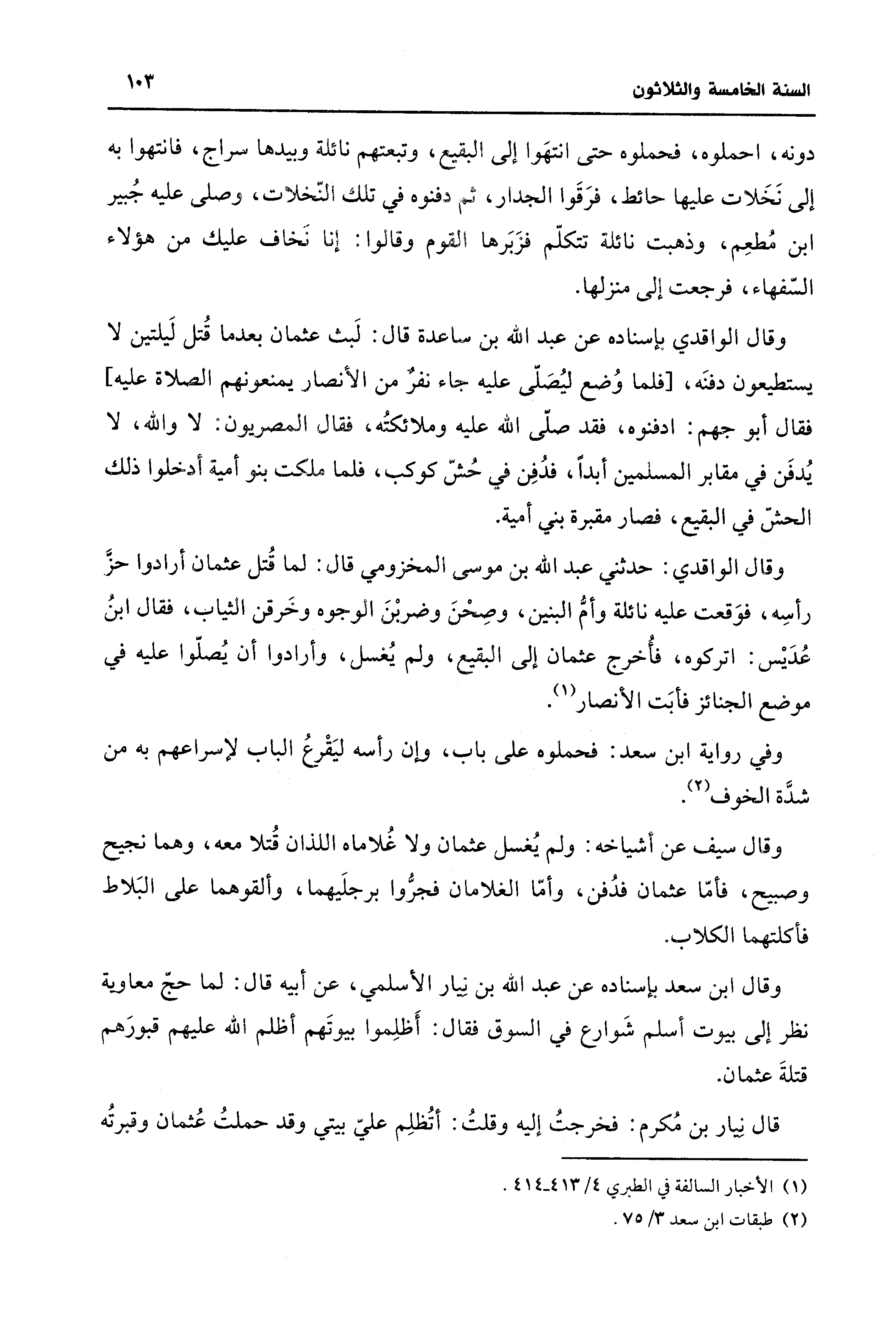 وقال الواقدي: حدثتي عبد الله بن موسى المخزومي قال: لما قُتل عثمان أرادوا حزَّ رأسِه، فوَقعت عليه نائلة وأمُّ البنين، وصِحْنَ وضربْنَ الوجوه وخَرقن الثياب، فقال ابنُ عُدَيس: اتركوه، فأُخرج عثمان إلى البقيع، ولم يُغسل، وأرادوا أن يُصلّوا عليه في موضع الجنائز فأبَت الأنصار (¬1).