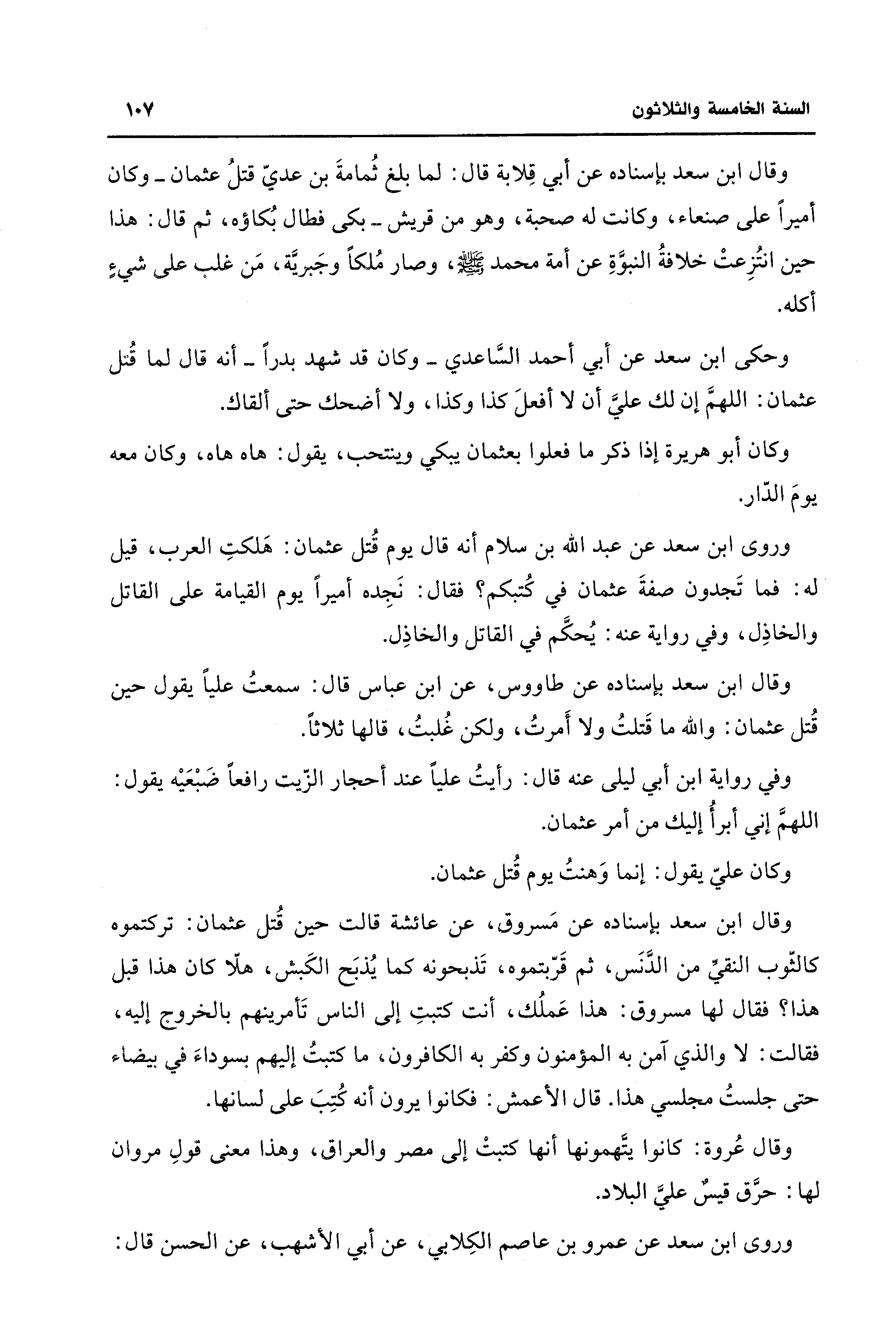 وقال ابن سعد بإسناده عن مَسروق، عن عائشة قالت حين قُتل عثمان: تركتموه كالثّوب النقيِّ من الدَّنَس، ثم قَرّبتموه، تَذبحونه كما يُذبَح الكَبش، هلّا كان هذا قبل هذا؟ فقال لها مسروق: هذا عَملُك، أنت كتبتِ إلى الناس تَأمرينهم بالخروج إليه، فقالت: لا والذي آمن به المؤمنون وكفر به الكافرون، ما كتبتُ إليهم بسوداءَ في بيضاء حتى جلستُ مجلسي هذا. قال الأعمش: فكانوا يرون أنه كُتِبَ على لسانها.