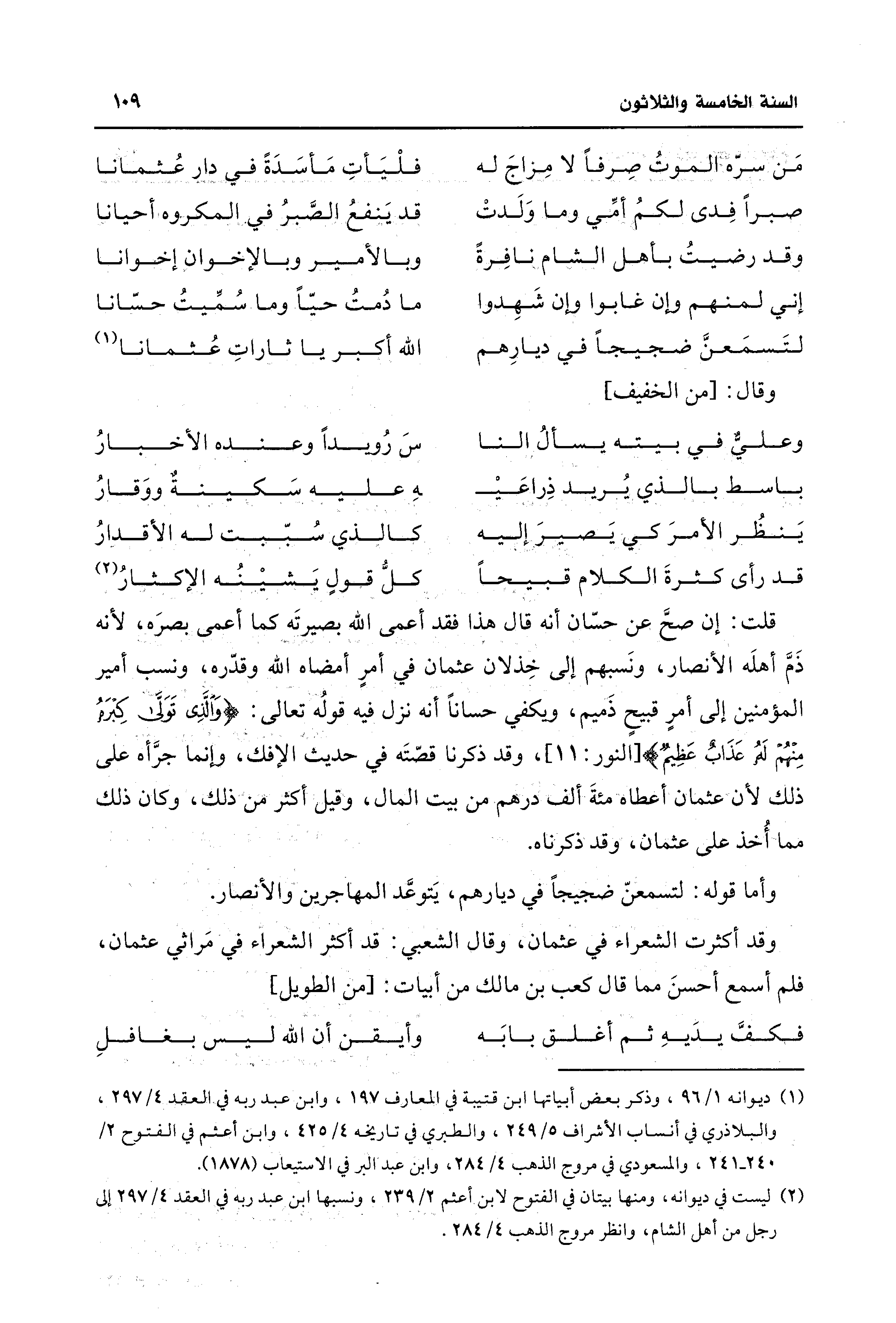 وقد أكثرت الشعراء في عثمان، وقال الشعبي: قد أكثر الشعراء في مَراثي عثمان، فلم أسمع أحسنَ مما قال كعب بن مالك من أبيات: [من الطويل]