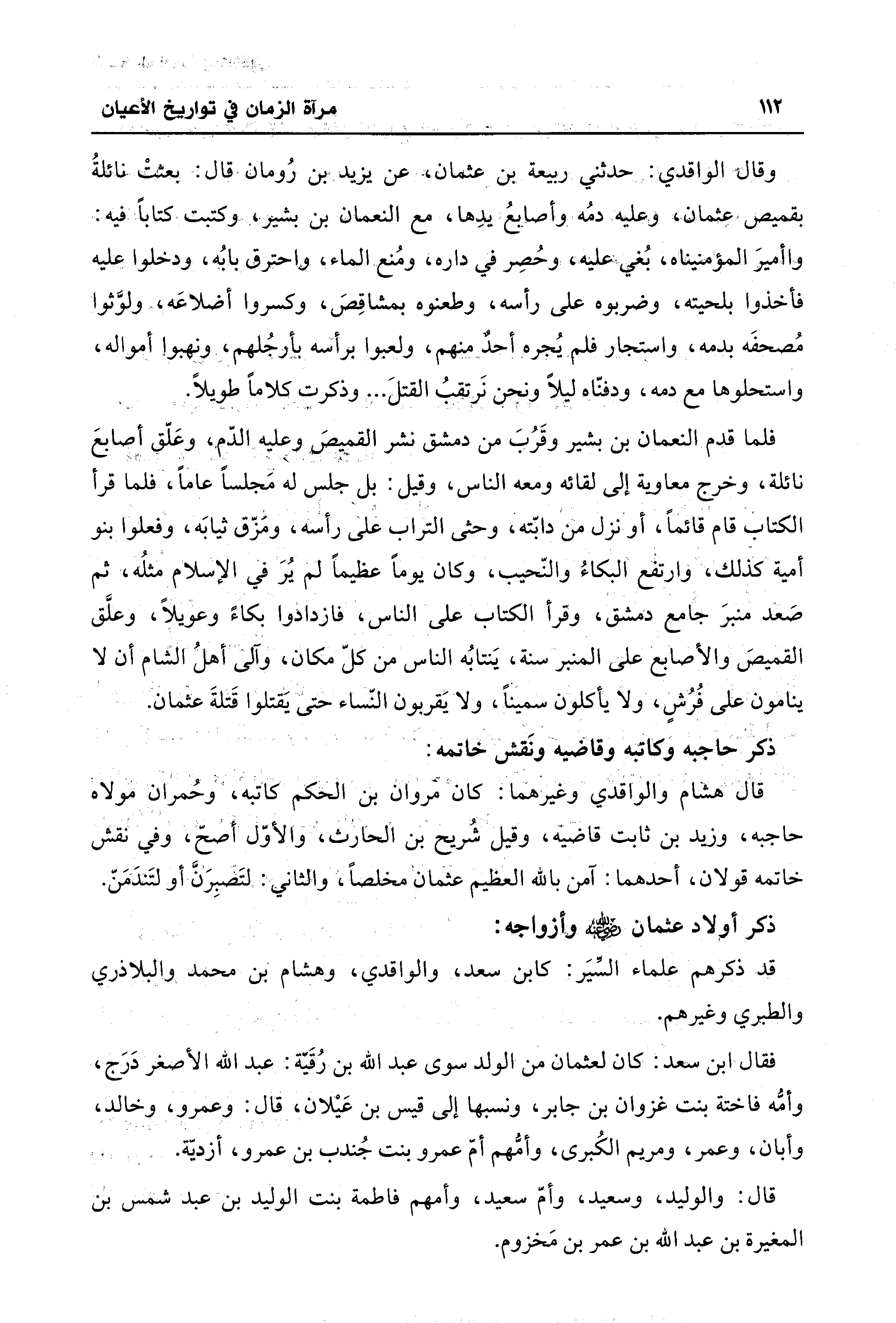 وقال الواقدي: حدثني ربيعة بن عثمان، عن يزيد بن رُومان. قال: بعثتْ نائلةُ بقميص عثمان، وعليه دمُه وأصابعُ يدِها، مع النعمان بن بشير، وكتبت كتابًا فيه: وأمير المؤمنين، بُغي عليه، وحُصِر في داره، ومُنع الماء، واحترق بابُه، ودخلوا عليه فأخذوا بلحيته، وضربوه على رأسه، وطعنوه بمشاقِصَ، وكسروا أضلاعَه، ولوَّثوا مُصحفَه بدمه، واستجار فلم يُجره أحدٌ منهم، ولعبوا برأسه بأرجُلهم، ونهبوا أمواله، واستحلوها مع دمه، ودفنّاه ليلًا ونحن نرتقبُ القتلَ ... وذكرت كلامًا طويلًا.