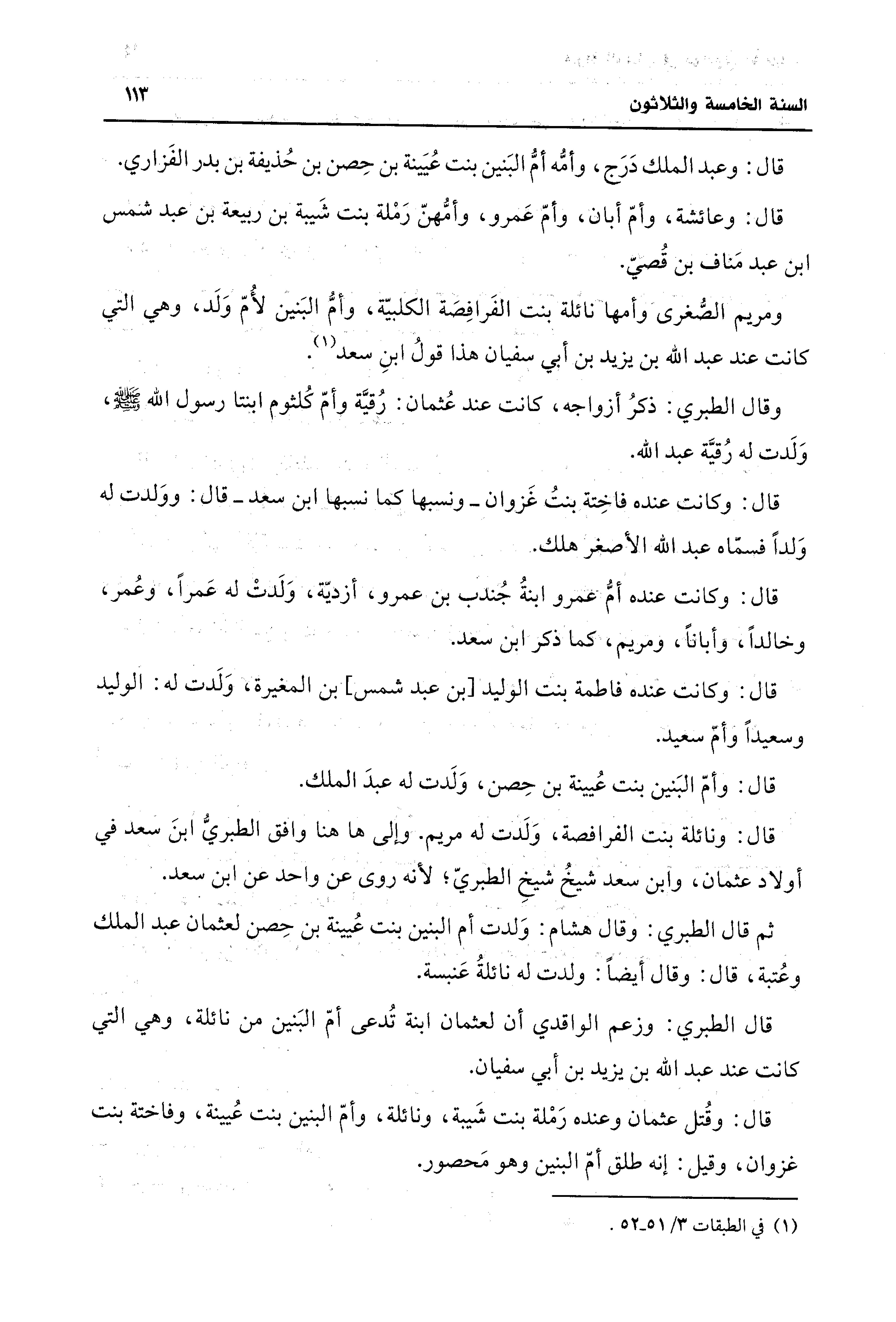 ثم قال الطبري: وقال هشام: وَلدت أم البنين بنت عُيينة بن حِصن لعثمان عبد الملك وعُتبة، قال: وقال أيضًا: ولدت له نائلةُ عَنبسة.