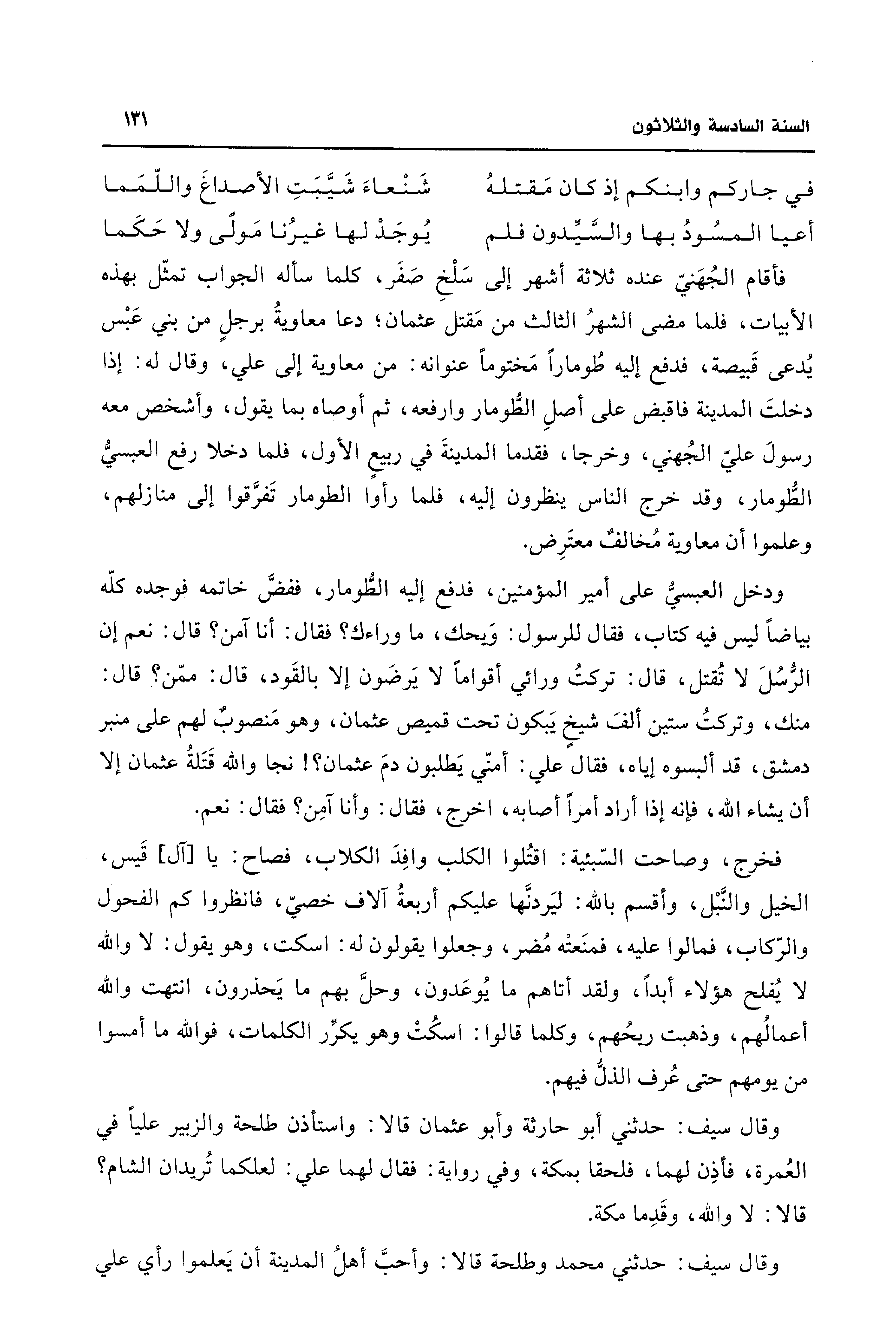 وقال سيف: حدثني محمد وطلحة قالا: وأحبَّ أهلُ المدينة أن يَعلموا رأي علي