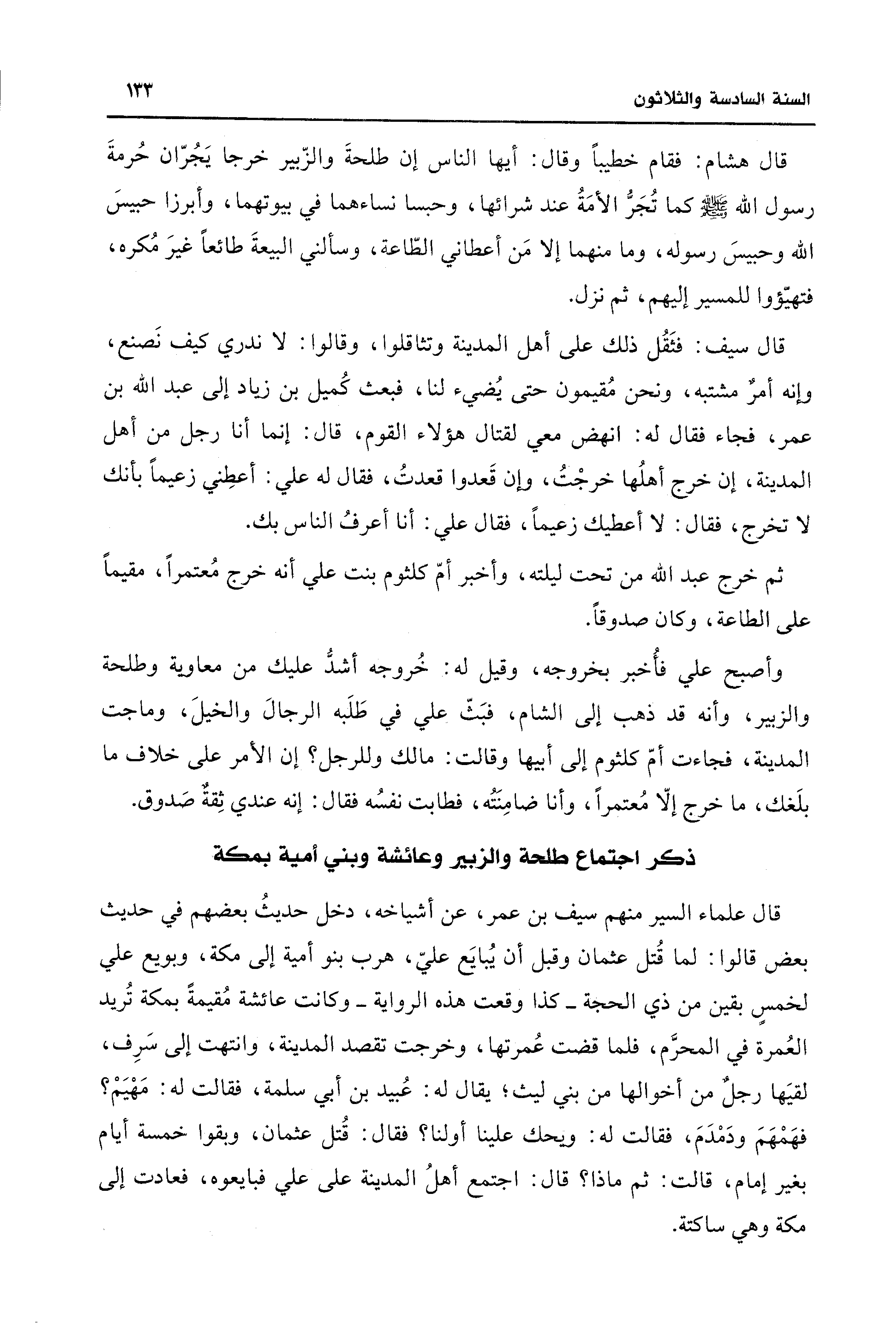 قال هشام: فقام خطيبًا وقال: أيها الناس إن طلحةَ والزّبير خرجا يَجُرّان حُرمةَ رسول الله - صلى الله عليه وسلم - كما تُجَرُّ الأمَةُ عند شرائها، وحبسا نساءهما في بيوتهما، وأبرزا حبيسَ الله وحبيسَ رسوله، وما مثهما إلا مَن أعطاني الطاعة، وسألني البيعةَ طائعًا غيرَ مُكره، فتهيّؤوا للمسير إليهم، ثم نزل.