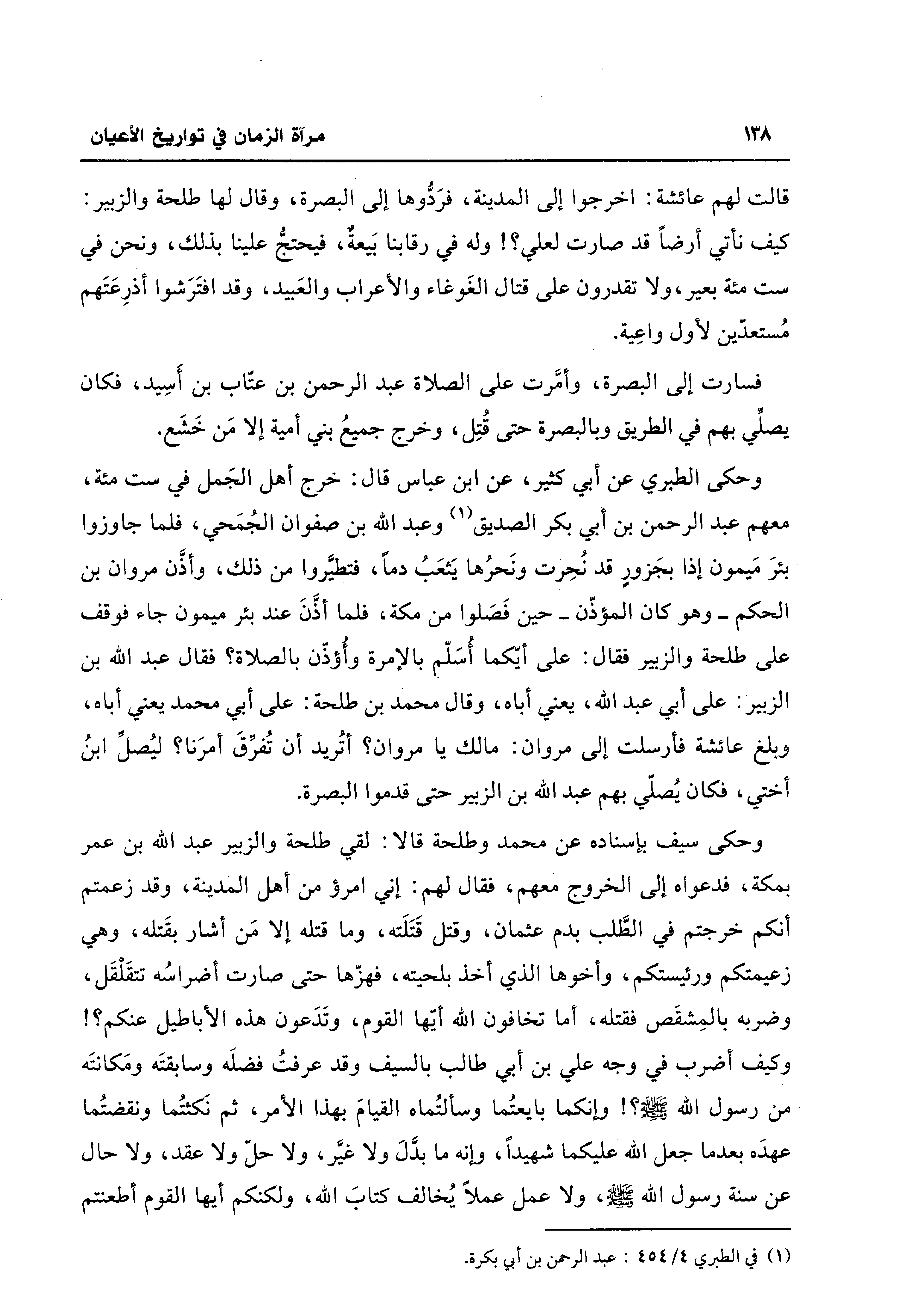 وحكى الطبري عن أبي كثير، عن ابن عباس قال: خرج أهل الجَمل في ست مئة، معهم عبد الرحمن بن أبي بكر الصديق (¬1) وعبد الله بن صفوان الجُمَحي، فلما جاوزوا بئرَ مَيمون إذا بجَزورٍ قد نُحِرت ونَحرُها يَثعَبُ دمًا، فتطيَّروا من ذلك، وأذَّن مروان بن الحكم -وهو كان المؤذّن- حين فَصَلوا من مكة، فلما أذَّنَ عند بئر ميمون جاء فوقف على طلحة والزبير فقال: على أيّكما أُسَلّم بالإمرة وأُؤذّن بالصلاة؟ فقال عبد الله بن الزبير: على أبي عبد الله، يعني أباه، وقال محمد بن طلحة: على أبي محمد يعني أباه، وبلغ عائشة فأرسلت إلى مروان: مالك يا مروان؟ أتُريد أن تُفرِّقَ أمرَنا؟ ليُصلِّ ابنُ أختي، فكان يُصلّي بهم عبد الله بن الزبير حتى قدموا البصرة.
