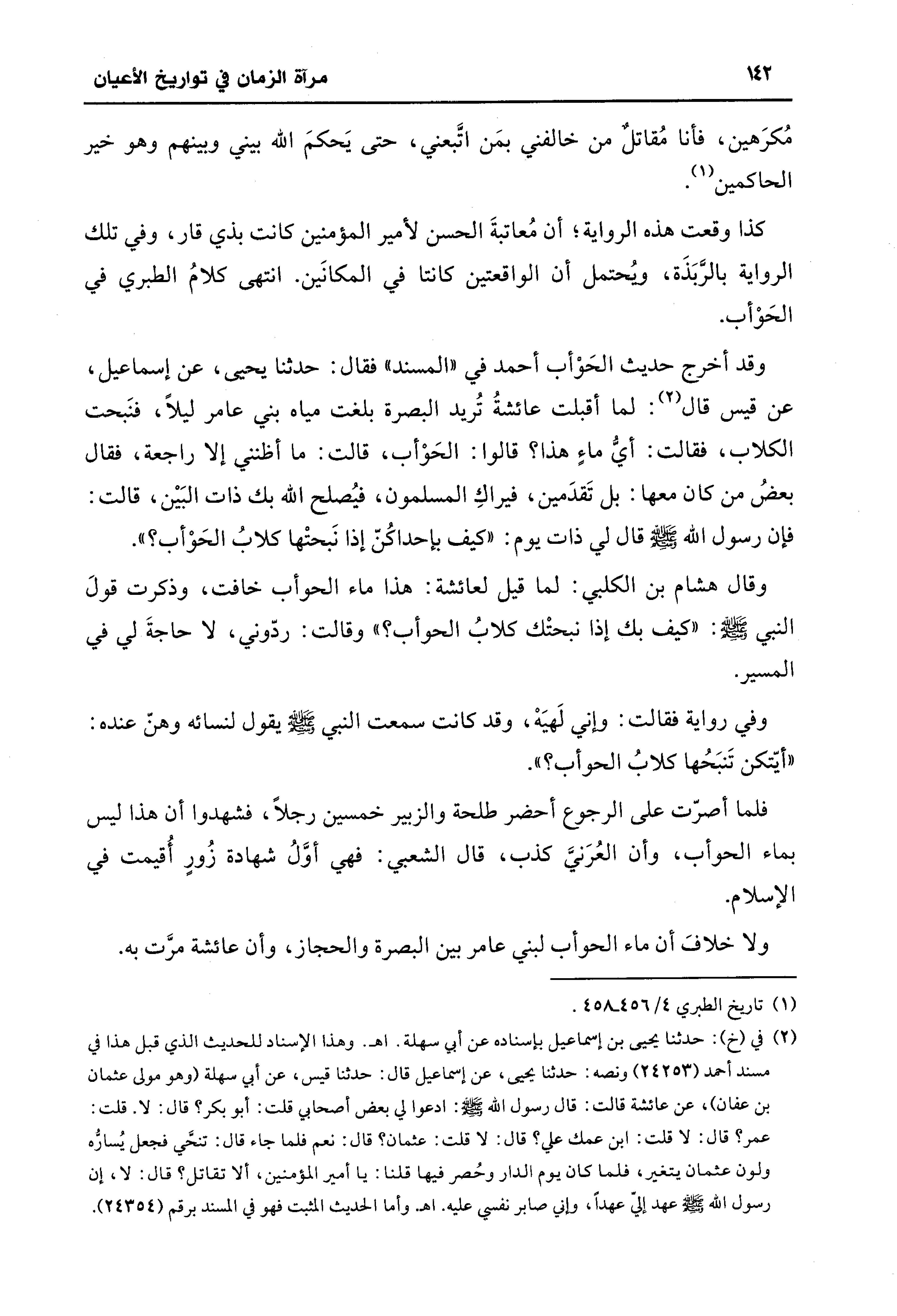 وقد أخرج حديث الحَوْأب أحمد في "المسند" فقال: حدثنا يحيى، عن إسماعيل، عن قيس قال (¬2): لما أقبلت عائشةُ تُريد البصرة بلغت مياه بني عامر ليلًا، فنَبحت الكلاب، فقالت: أيُّ ماءٍ هذا؟ قالوا: الحَوْأب، قالت: ما أظنني إلا راجعة، فقال بعضُ من كان معها: بل تَقدَمين، فيراكِ المسلمون، فيُصلح الله بك ذات البَين، قالت: فإن رسول الله - صلى الله عليه وسلم - قال لي ذات يوم: "كيف بإحداكُنّ إذا نَبحتْها كلابُ الحَوْأب؟ ".