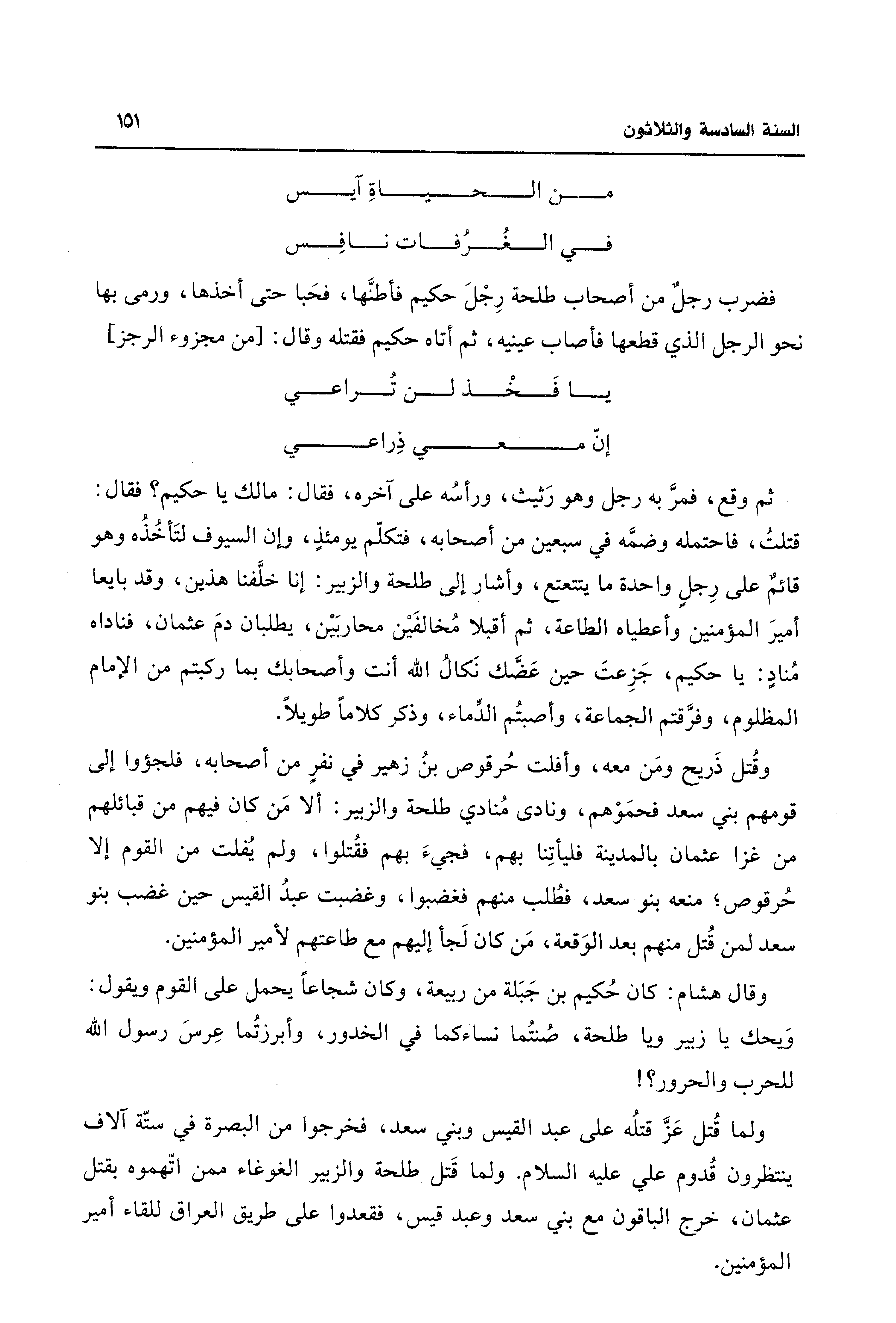 فضرب رجلٌ من أصحاب طلحة رِجْلَ حكيم فأطنَّها، فحَبا حتى أخذها، ورمى بها نحو الرجل الذي قطعها فأصاب عينيه، ثم أتاه حكيم فقتله وقال: [من مجزوء الرجز]