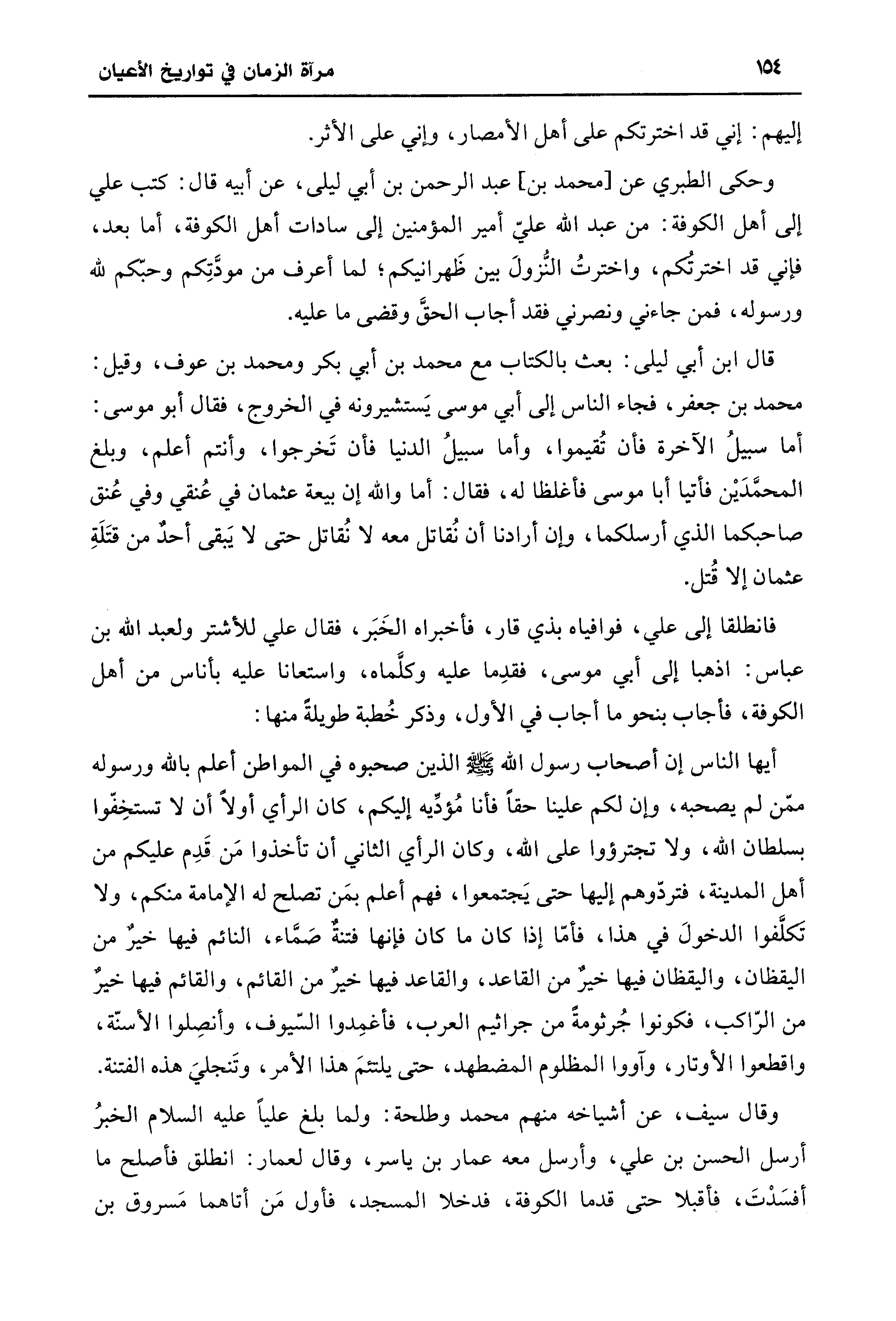 وحكى الطبري عن [محمد بن] عبد الرحمن بن أبي ليلى، عن أبيه قال: كتب علي إلى أهل الكوفة: من عبد الله عليّ أمير المؤمنين إلى سادات أهل الكوفة، أما بعد، فإني قد اخترتُكم، واخترتُ النُّزولَ بين ظَهرانيكم؛ لما أعرف من مودَّتِكم وحبّكم لله ورسوله، فمن جاءني ونصرني فقد أجاب الحقَّ وقضى ما عليه.
