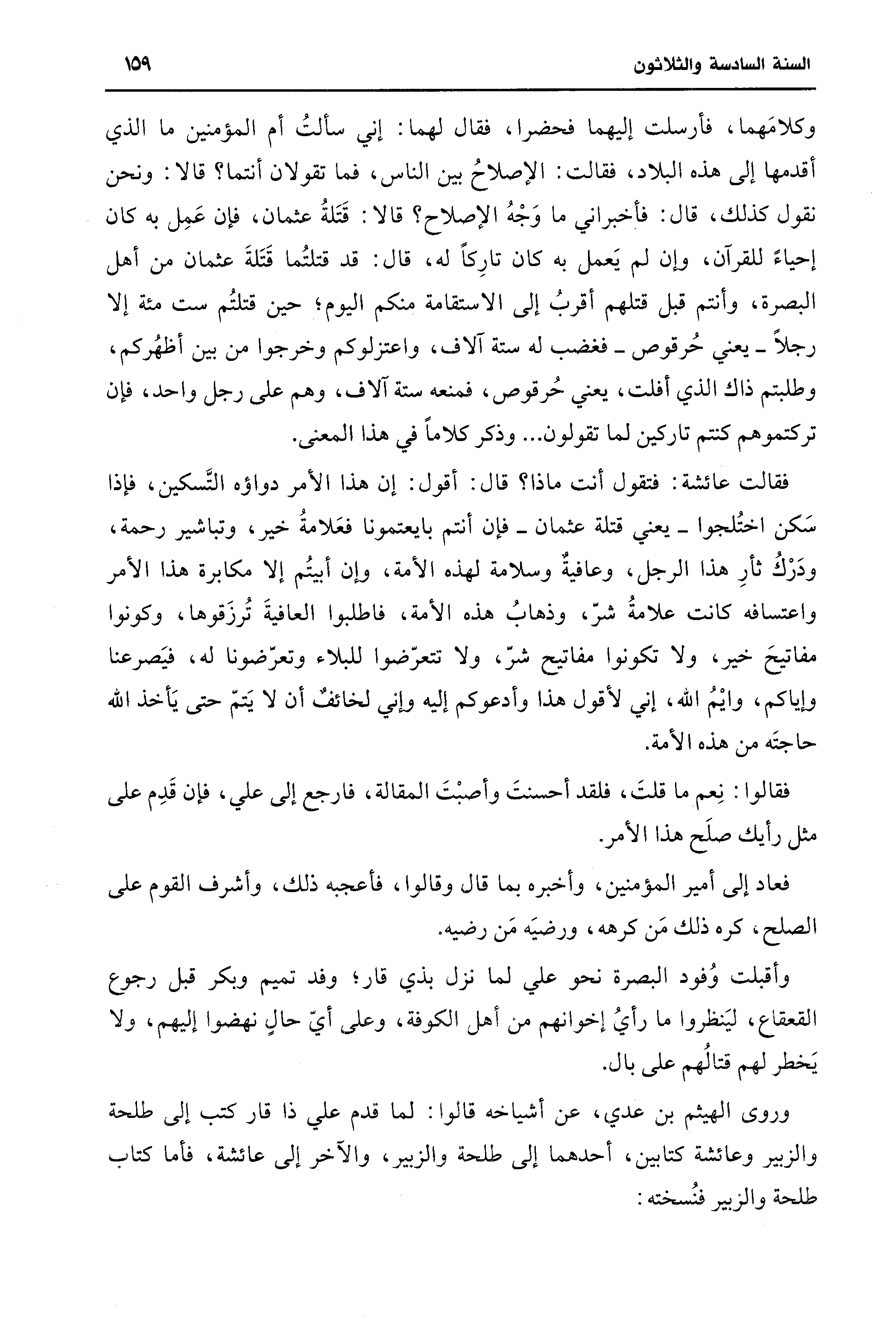 وكلامهما، فأرسلت إليهما فحضرا، فقال لهما: إني سألتُ أم المؤمنين ما الذي أقدمها إلى هذه البلاد، فقالت: الإصلاحُ بين الناس، فما تقولان أنتما؟ قالا: ونحن نقول كذلك، قال: فأخبراني ما وَجْهُ الإصلاح؟ قالا: قَتَلةُ عثمان، فإن عَمِل به كان إحياءً للقرآن، وإن لم يَعمل به كان تارِكًا له، قال: قد قتلتُما قَتَلةَ عثمان من أهل البصرة، وأنتم قبل قتلهم أقربُ إلى الاستقامة منكم اليوم؛ حين قتلتُم ست مئة إلا رجلًا -يعني حُرقوص- فغضب له ستة آلاف، واعتزلوكم وخرجوا من بين أظهُركم، وطلبتم ذاك الذي أفلت، يعني حُرقوص، فمنعه ستة آلاف، وهم على رجل واحد، فإن تركتموهم كنتم تاركين لما تقولون ... وذكر كلامًا في هذا المعنى.