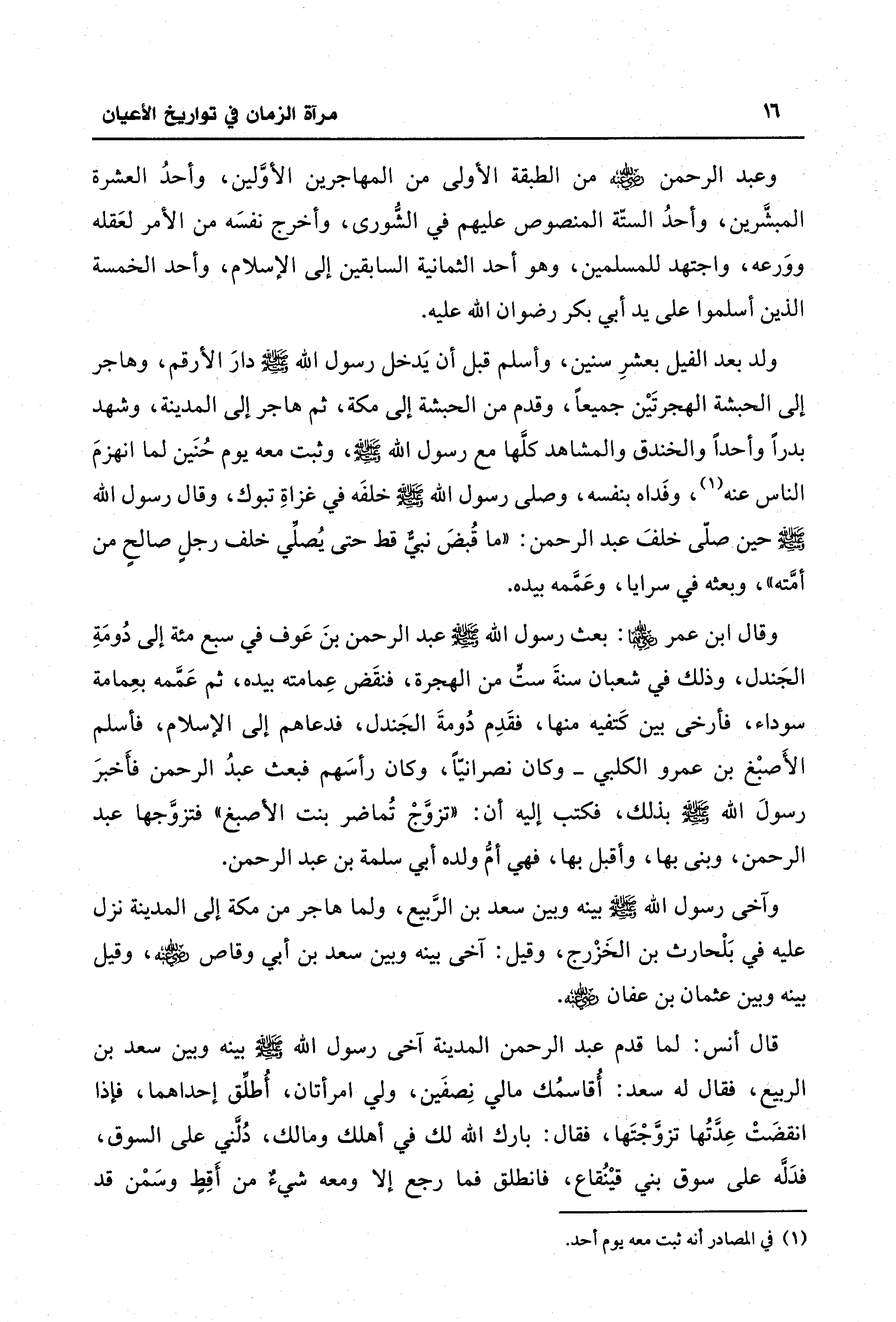وعبد الرحمن - رضي الله عنه - من الطبقة الأولى من المهاجرين الأوَّلين، وأحدُ العشرة المبشَّرين، وأحدُ الستّة المنصوص عليهم في الشُّورى، وأخرج نفسَه من الأمر لعَقله ووَرعه، واجتهد للمسلمين، وهو أحد الثمانية السابقين إلى الإسلام، وأحد الخمسة الذين أسلموا على يد أبي بكر رضوان الله عليه.
