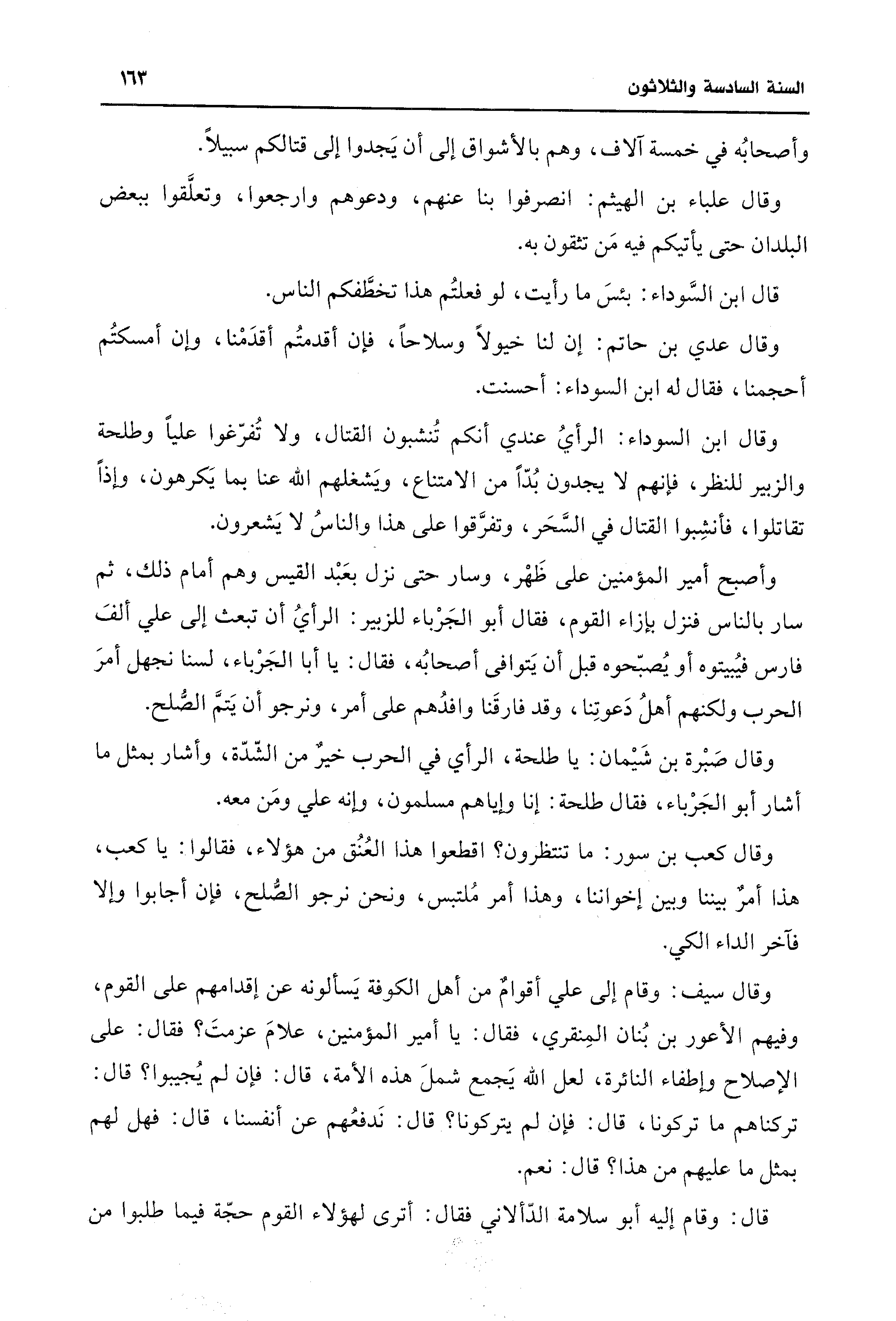 وقال كعب بن سور: ما تنتظرون؟ اقطعوا هذا العُنُق من هؤلاء، فقالوا يا كعب، هذا أمرٌ بيننا وبين إخواننا، وهذا أمر مُلتبس، ونحن نرجو الصُّلح، فإن أجابوا وإلا فآخر الداء الكي.