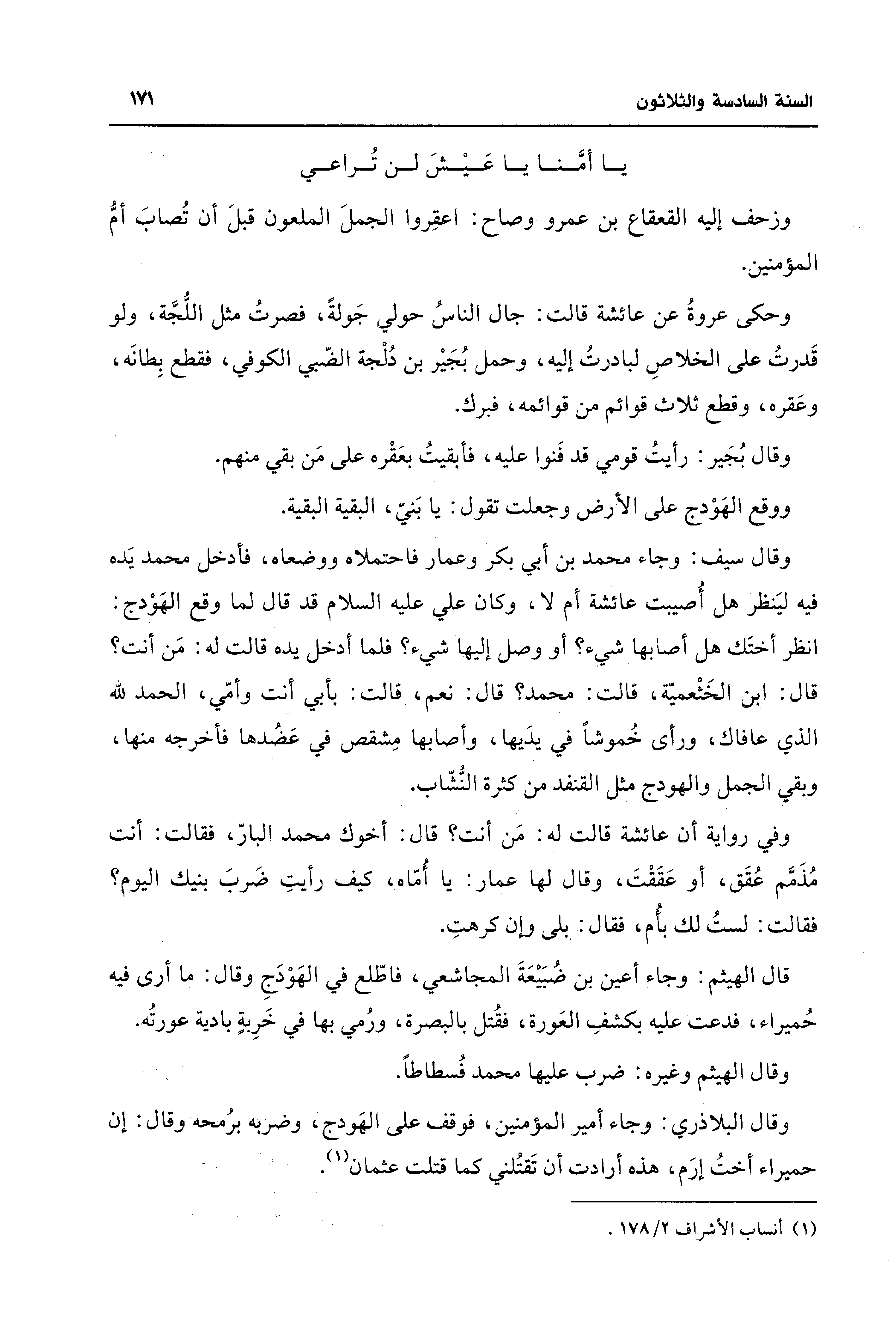 وقال البلاذري: وجاء أمير المؤمنين، فوقف على الهَودج، وضربه برُمحه وقال: إن حميراء أختُ إرَم، هذه أرادت أن تَقتلني كما قتلت عثمان (¬1).