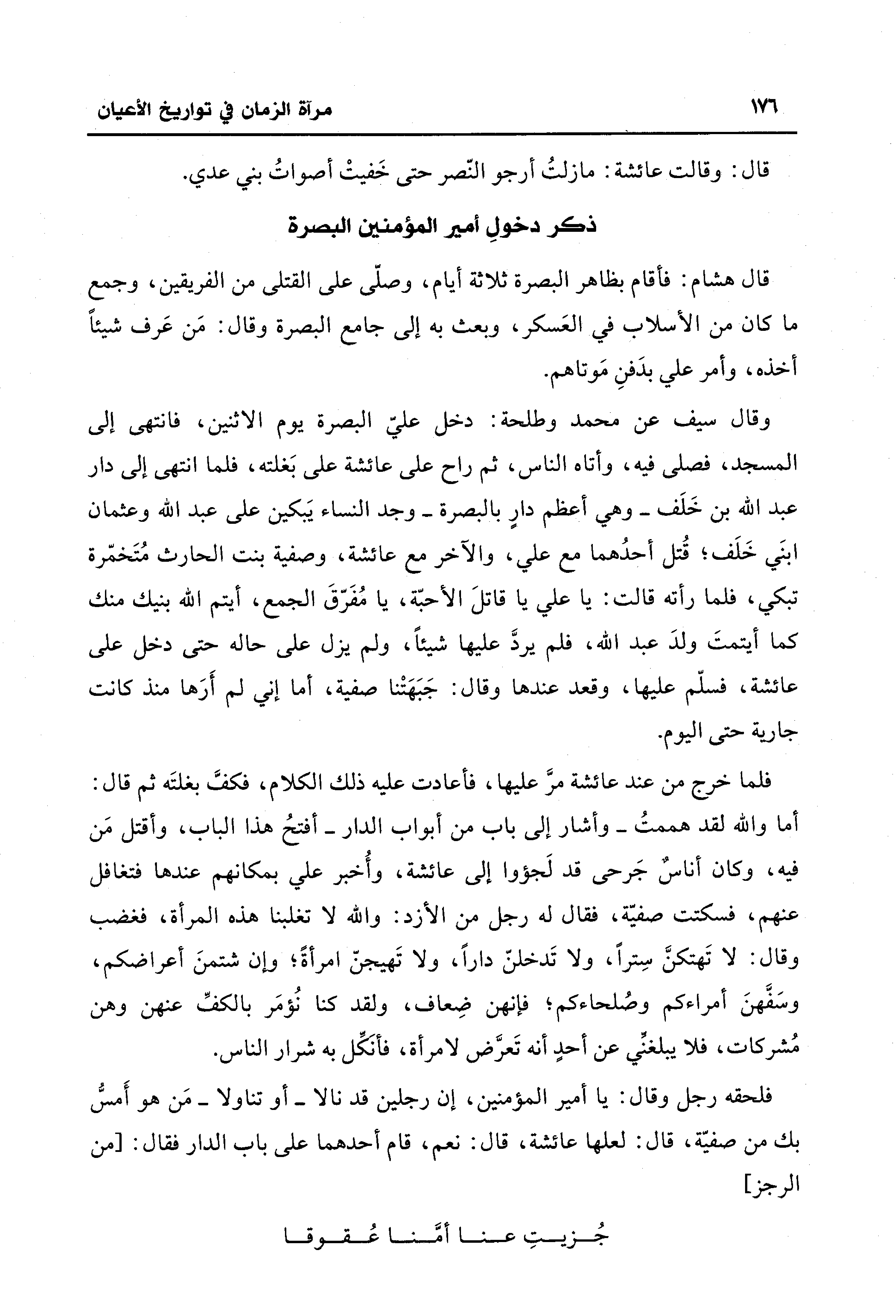 فلما خرج من عند عائشة مرَّ عليها، فأعادت عليه ذلك الكلام، فكفَّ بغلتَه ثم قال: أما والله لقد هممتُ -وأشار إلى باب من أبواب الدار- أفتحُ هذا الباب، وأقتل مَن فيه، وكان أناسٌ جَرحى قد لَجؤوا إلى عائشة، وأُخبر علي بمكانهم عندها فتغافل عنهم، فسكتت صفيّة، فقال له رجل من الأزد: والله لا تغلبنا هذه المرأة، فغضب وقال: لا تَهتكنَّ سِترًا، ولا تَدخلنّ دارًا، ولا تَهيجنّ امرأة؛ وإن شتمنَ أعراضكم، وسَفَّهنَ أمراءكم وصُلحاءكم؛ فإنهن ضِعاف، ولقد كنا نُؤمَر بالكفِّ عنهن وهن مُشركات، فلا يبلغنِّي عن أحدٍ أنه تَعرَّض لامرأة، فأنكِّل به شرار الناس.