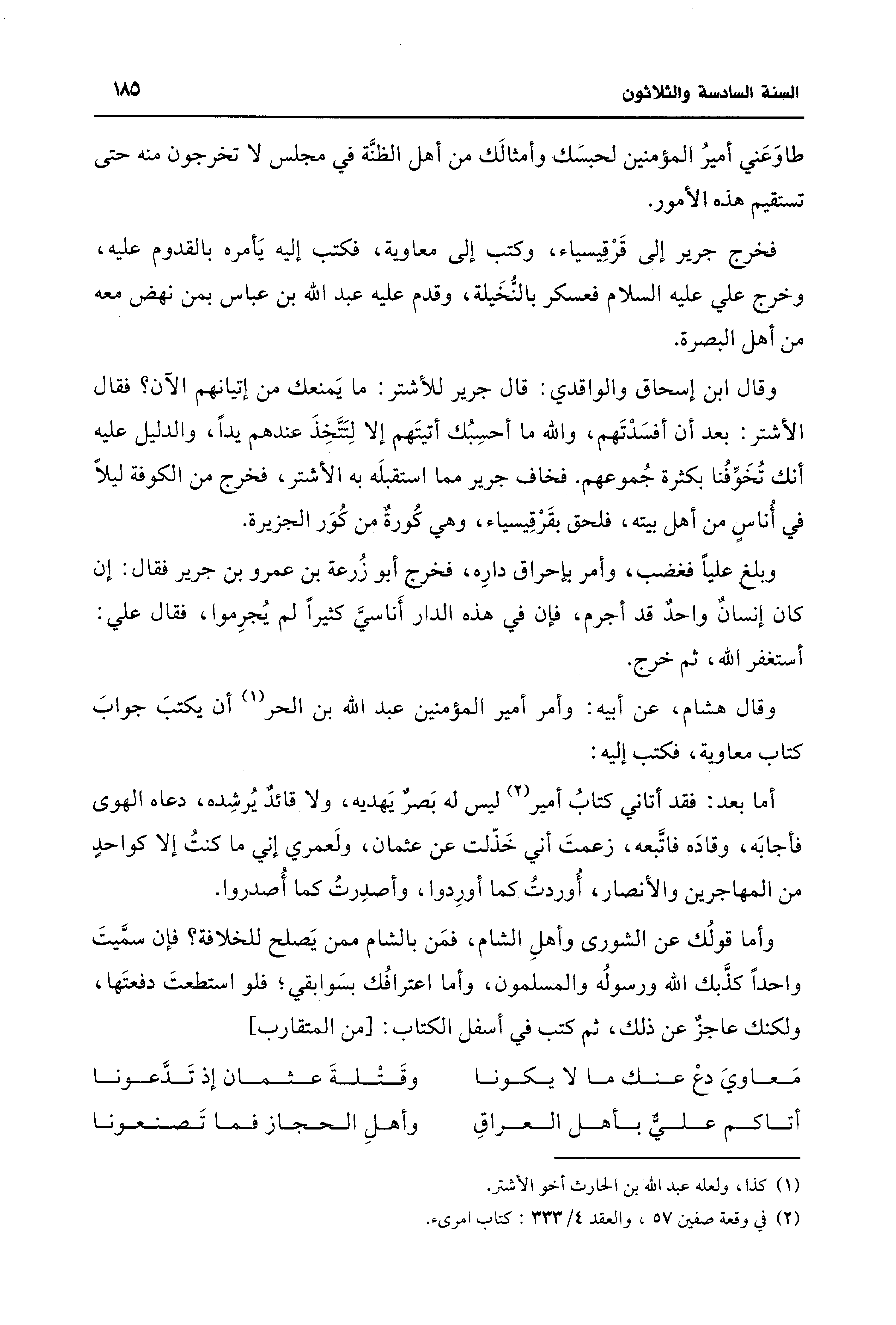 وقال هشام، عن أبيه: وأمر أمير المؤمنين عبد الله بن الحر (¬1) أن يكتبَ جوابَ كتاب معاوية، فكتب إليه: