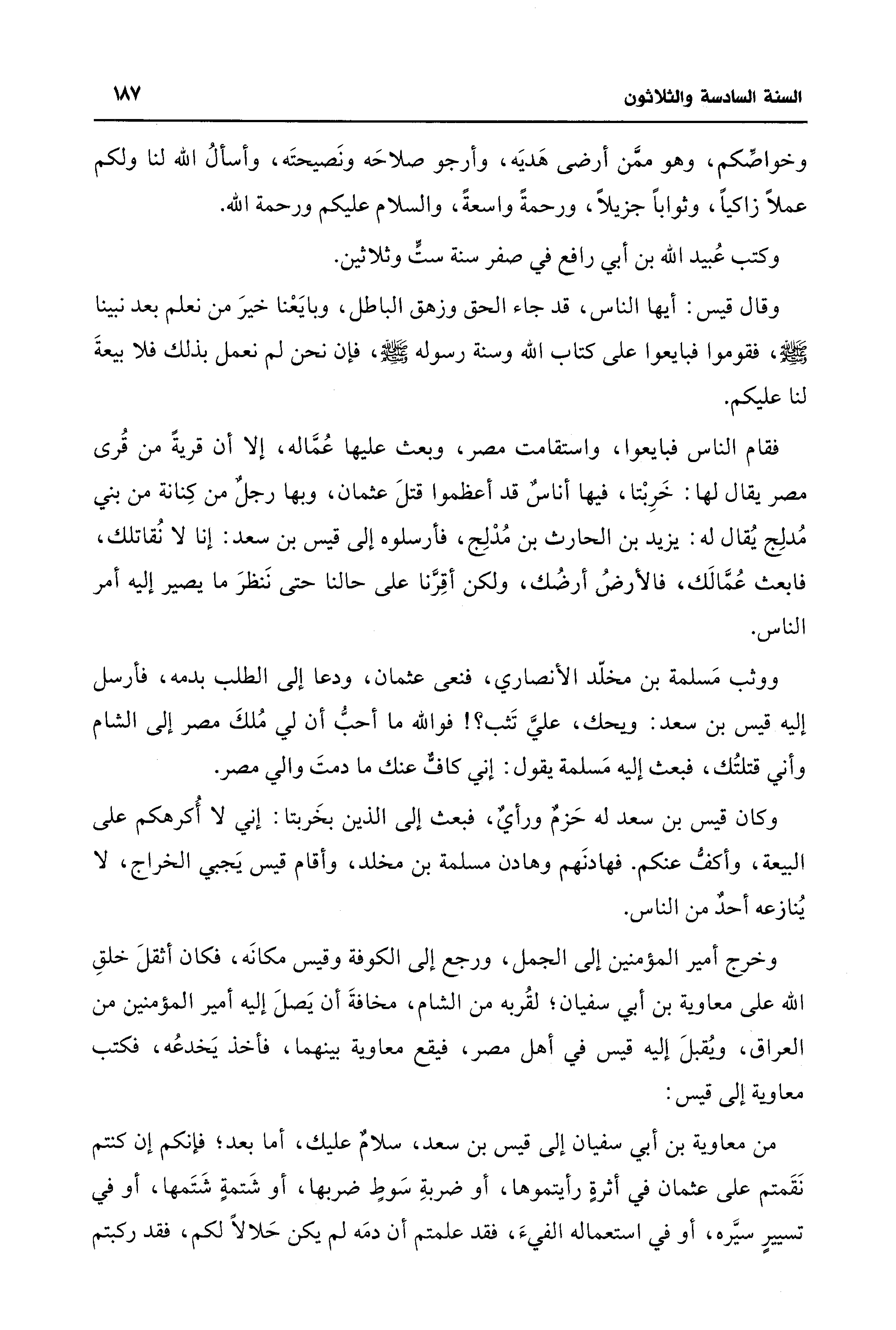 من معاوية بن أبي سفيان إلى قيس بن سعد، سلامٌ عليك، أما بعد؛ فإنكم إن كنتم نَقَمتم على عثمان في أثرةٍ رأيتموها، أو ضربةِ سَوطٍ ضربها، أو شَتمةٍ شَتَمها، أو في تسييرٍ سيَّره، أو في استعماله الفيءَ، فقد علمتم أن دمَه لم يكن حَلالًا لكم، فقد ركبتم