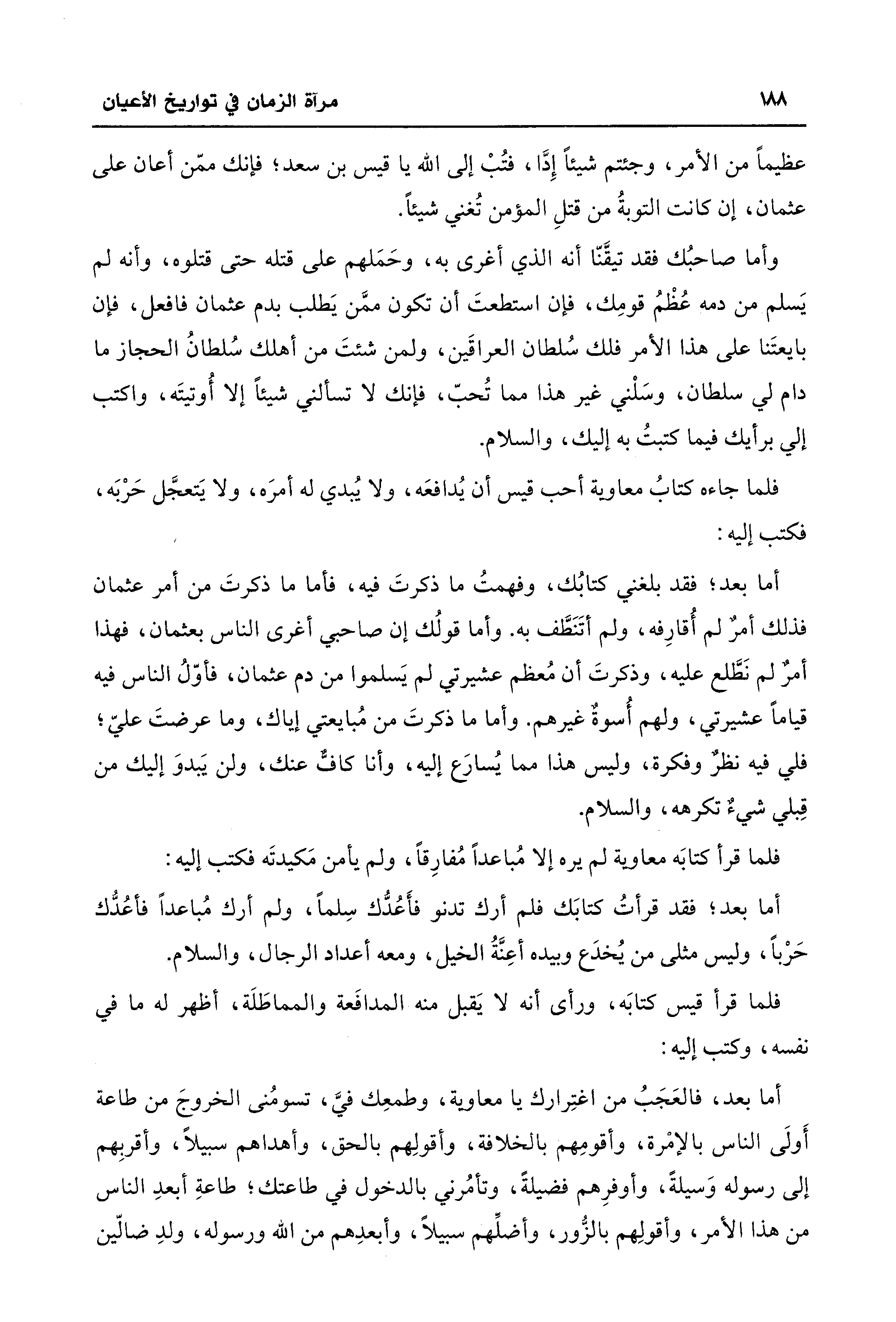أما بعد؛ فقد بلغني كتابُك، وفهمتُ ما ذكرتَ فيه، فأما ما ذكرتَ من أمر عثمان فذلك أمرٌ لم أُقارِفه، ولم أتَنَطَّف به. وأما قولُك إن صاحبي أغرى الناس بعثمان، فهذا أمرٌ لم نَطَّلع عليه، وذكرتَ أن مُعظم عشيرتي لم يَسلموا من دم عثمان، فأوّلُ الناس فيه قيامًا عشيرتي، ولهم أُسوةٌ غيرهم. وأما ما ذكرتَ من مُبايعتي إياك، وما عرضتَ عليّ؛ فلي فيه نظرٌ وفكرة، وليس هذا مما يُسارَع إليه، وأنا كافٌّ عنك، ولن يَبدوَ إليك من قِبلي شيءٌ تكرهه، والسلام.