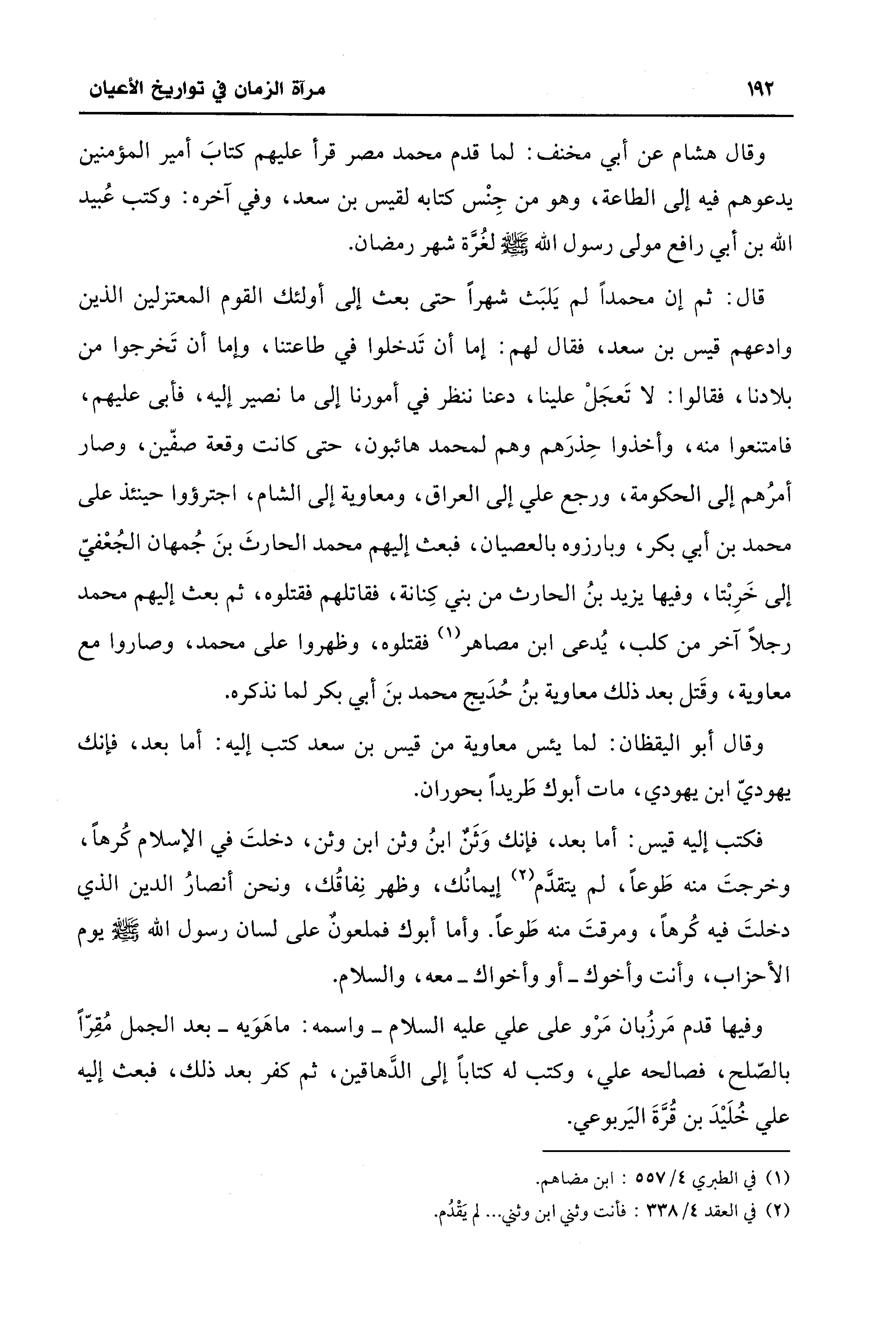 قال: ثم إن محمدًا لم يَلبَث شهرًا حتى بعث إلى أولئك القوم المعتزلين الذين وادعهم قيس بن سعد، فقال لهم: إما أن تَدخلوا في طاعتنا، وإما أن تَخرجوا من بلادنا، فقالوا: لا تَعجَلْ علينا، دعنا ننظر في أمورنا إلى ما نصير إليه، فأبى عليهم، فامتنعوا منه، وأخذوا حِذرَهم وهم لمحمد هائبون، حتى كانت وقعة صفّين، وصار أمرُهم إلى الحكومة، ورجع علي إلى العراق، ومعاوية إلى الشام، اجترؤوا حينئذ على محمد بن أبي بكر، وبارزوه بالعصيان، فبعث إليهم محمد الحارثَ بنَ جُمهان الجُعْفيّ إلى خَرِبْتا، وفيها يزيد بنُ الحارث من بني كِنانة، فقاتلهم فقتلوه، ثم بعث إليهم محمد رجلًا آخر من كلب، يُدعى ابن مصاهر (¬1) فقتلوه، وظهروا على محمد، وصاروا مع معاوية، وقَتل بعد ذلك معاوية بنُ حُدَيج محمد بنَ أبي بكر لما نذكره.