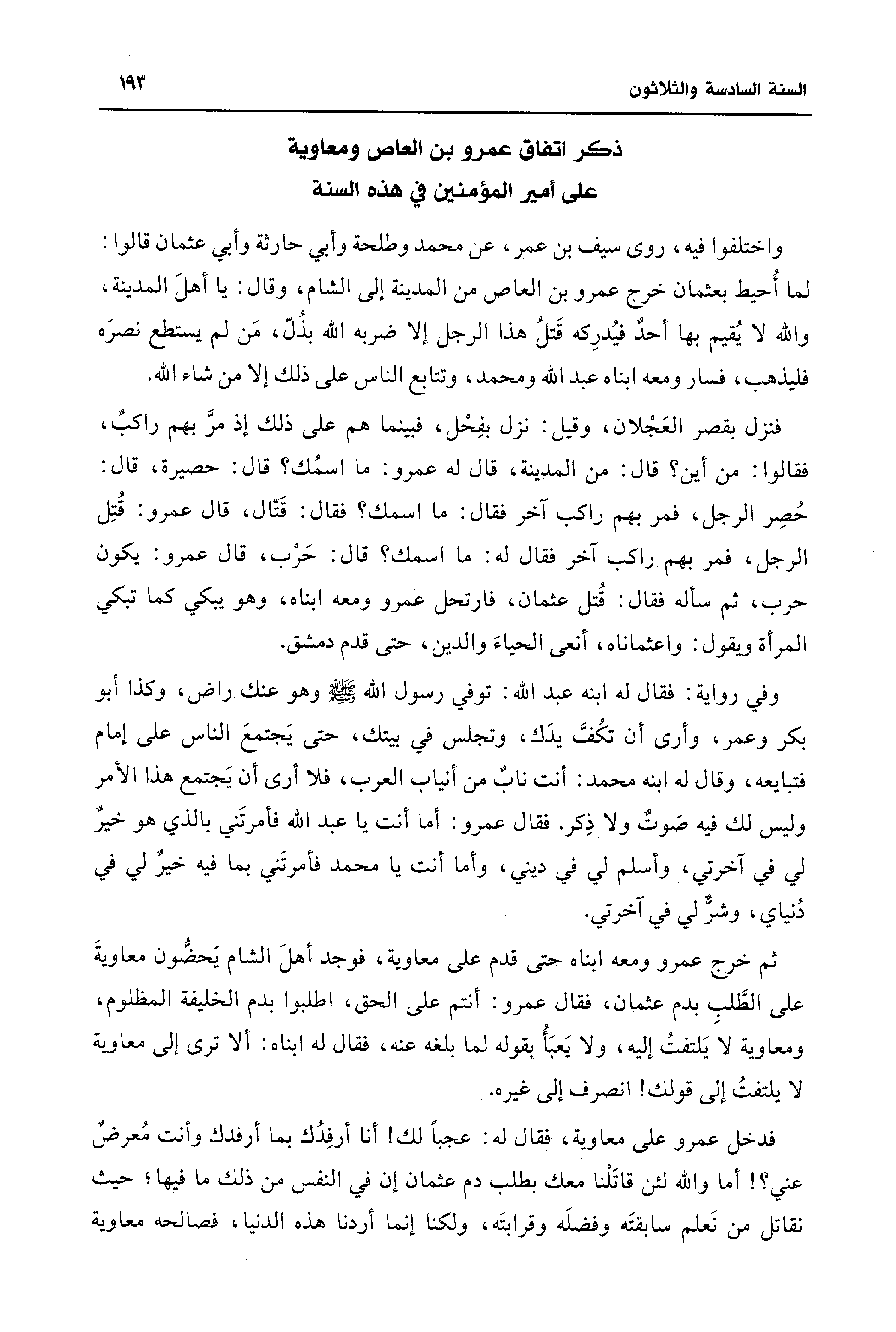 فنزل بقصر العَجْلان، وقيل: نزل بفِحْل، فبينما هم على ذلك إذ مرَّ بهم راكبٌ، فقالوا: من أين؟ قال: من المدينة، قال له عمرو: ما اسمُك؟ قال: حصيرة، قال: حُصِر الرجل، فمر بهم راكب آخر فقال: ما اسمك؟ فقال: قَتّال، قال عمرو: قُتِل الرجل، فمر بهم راكب آخر فقال له: ما اسمك؟ قال: حَرْب، قال عمرو: يكون حرب، ثم سأله فقال: قُتل عثمان، فارتحل عمرو ومعه ابناه، وهو يبكي كما تبكي المرأة ويقول: واعثماناه، أنعى الحياءَ والدين، حتى قدم دمشق.