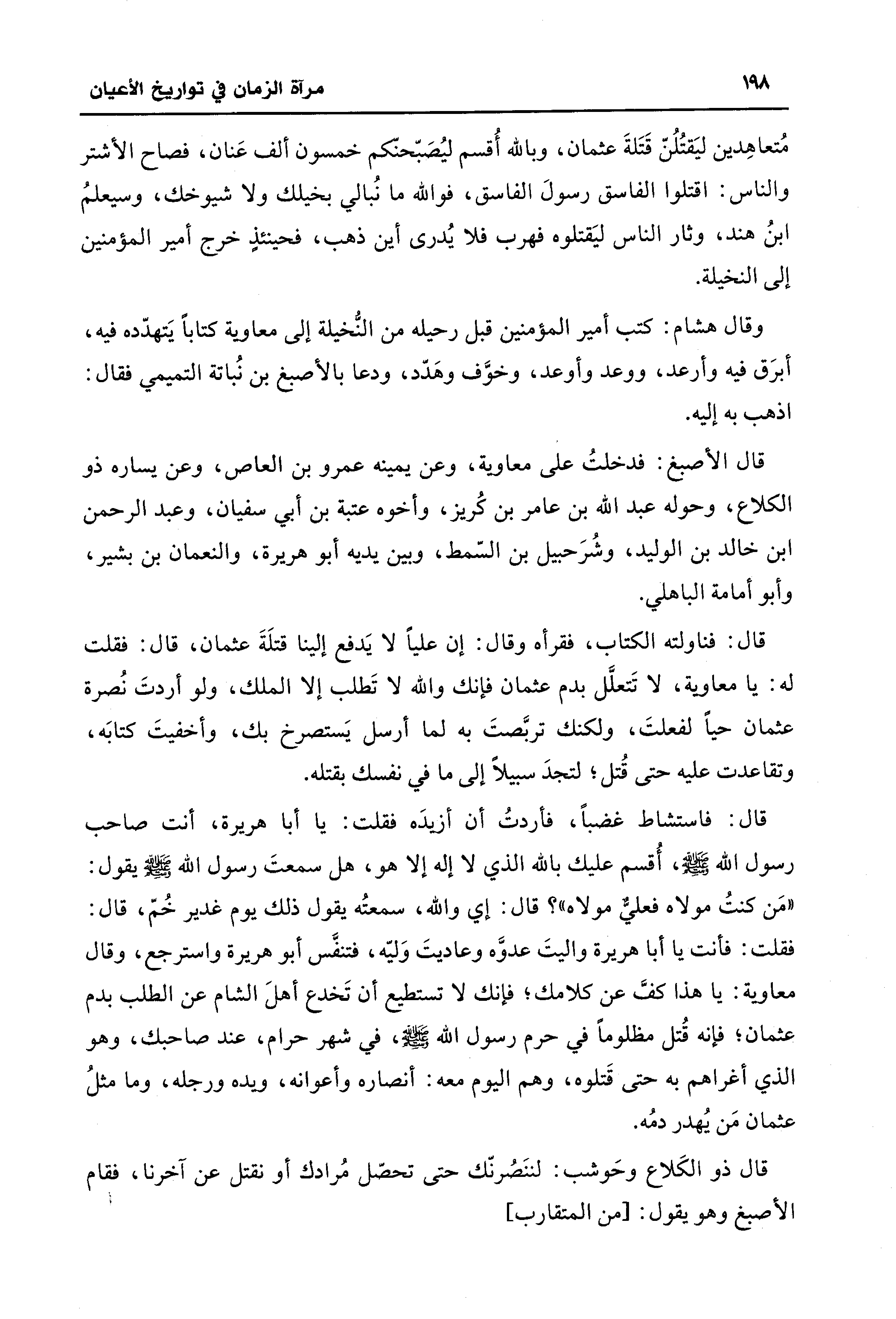 قال: فاستشاط غضبًا، فأردتُ أن أزيدَه فقلت: يا أبا هريرة، أنت صاحب رسول الله - صلى الله عليه وسلم -، أُقسم عليك بالله الذي لا إله إلا هو، هل سمعتَ رسول الله - صلى الله عليه وسلم - يقول: "مَن كنتُ مولاه فعليٌّ مولاه"؟ قال: إي والله، سمعتُه يقول ذلك يوم غدير خُمّ، قال: فقلت: فأنت يا أبا هريرة واليتَ عدوَّه وعاديتَ وَليّه، فتنفَّس أبو هريرة واسترجع، وقال معاوية: يا هذا كفَّ عن كلامك؛ فإنك لا تستطيع أن تَخدع أهلَ الشام عن الطلب بدم عثمان؛ فإنه قُتل مظلومًا في حرم رسول الله - صلى الله عليه وسلم -، في شهر حرام، عند صاحبك، وهو الذي أغراهم به حتى قَتلوه، وهم اليوم معه: أنصاره وأعوانه، ويده ورجله، وما مثلُ عثمان مَن يُهدر دمُه.