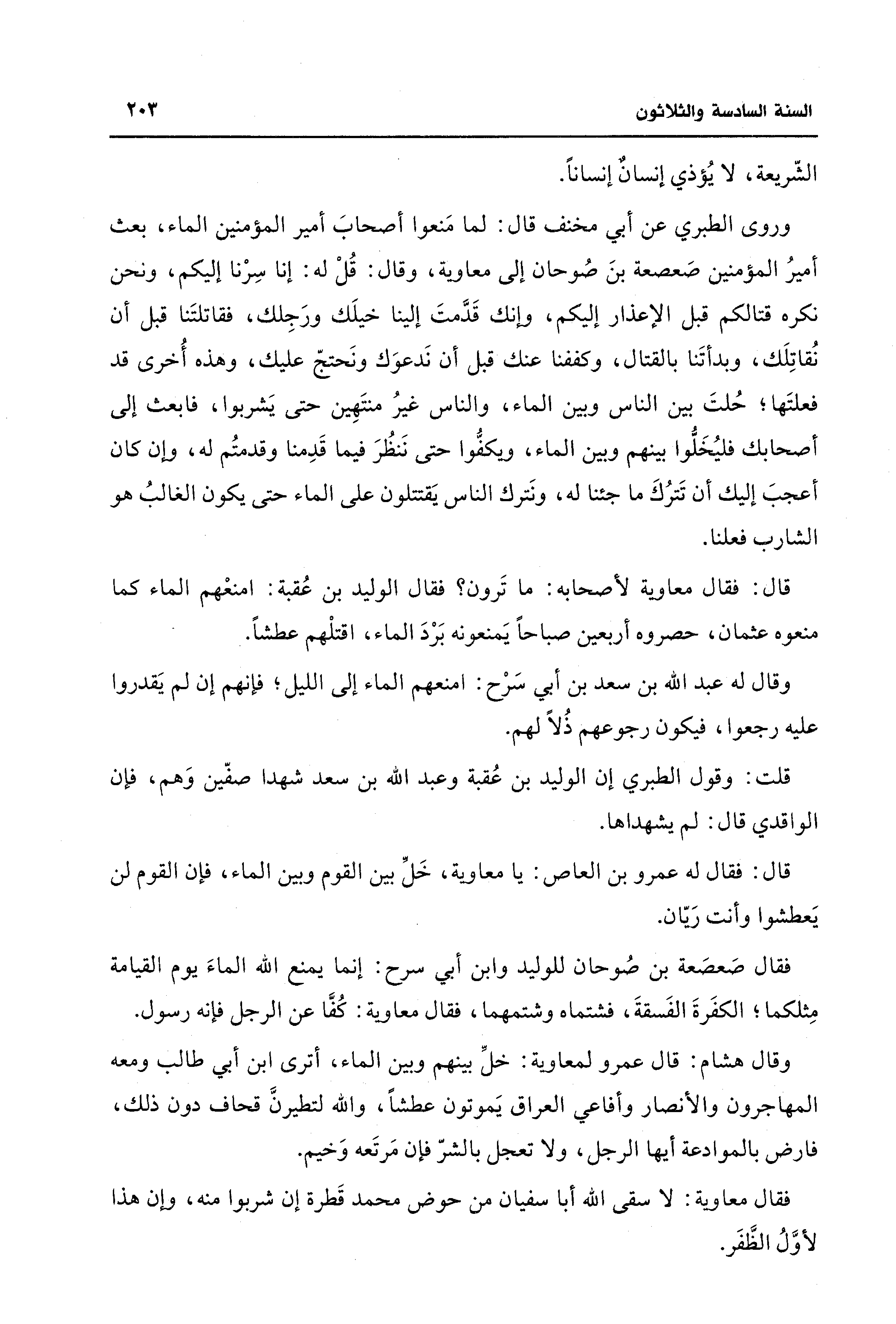 وروى الطبري عن أبي مخنف قال: لما مَنعوا أصحابَ أمير المؤمنين الماء، بعث أميرُ المؤمنين صَعصعة بنَ صُوحان إلى معاوية، وقال: قُلْ له: إنا سِرْنا إليكم، ونحن نكره قتالكم قبل الإعذار إليكم، وإنك قَدَّمتَ إلينا خيلَك ورَجِلك، فقاتلتَنا قبل أن نُقاتِلَك، وبدأتَنا بالقتال، وكففنا عنك قبل أن نَدعوَك ونَحتجّ عليك، وهذه أُخرى قد فعلتَها؛ حُلتَ بين الناس وبين الماء، والناس غيرُ منتَهِين حتى يَشربوا، فابعث إلى أصحابك فليُخَلُّوا بينهم وبين الماء، ويكفُّوا حتى نَنظُرَ فيما قَدِمنا وقدمتُم له، وإن كان أعجبَ إليك أن تَترُكَ ما جئنا له، ونَترك الناس يَقتتلون على الماء حتى يكون الغالبُ هو الشارب فعلنا.