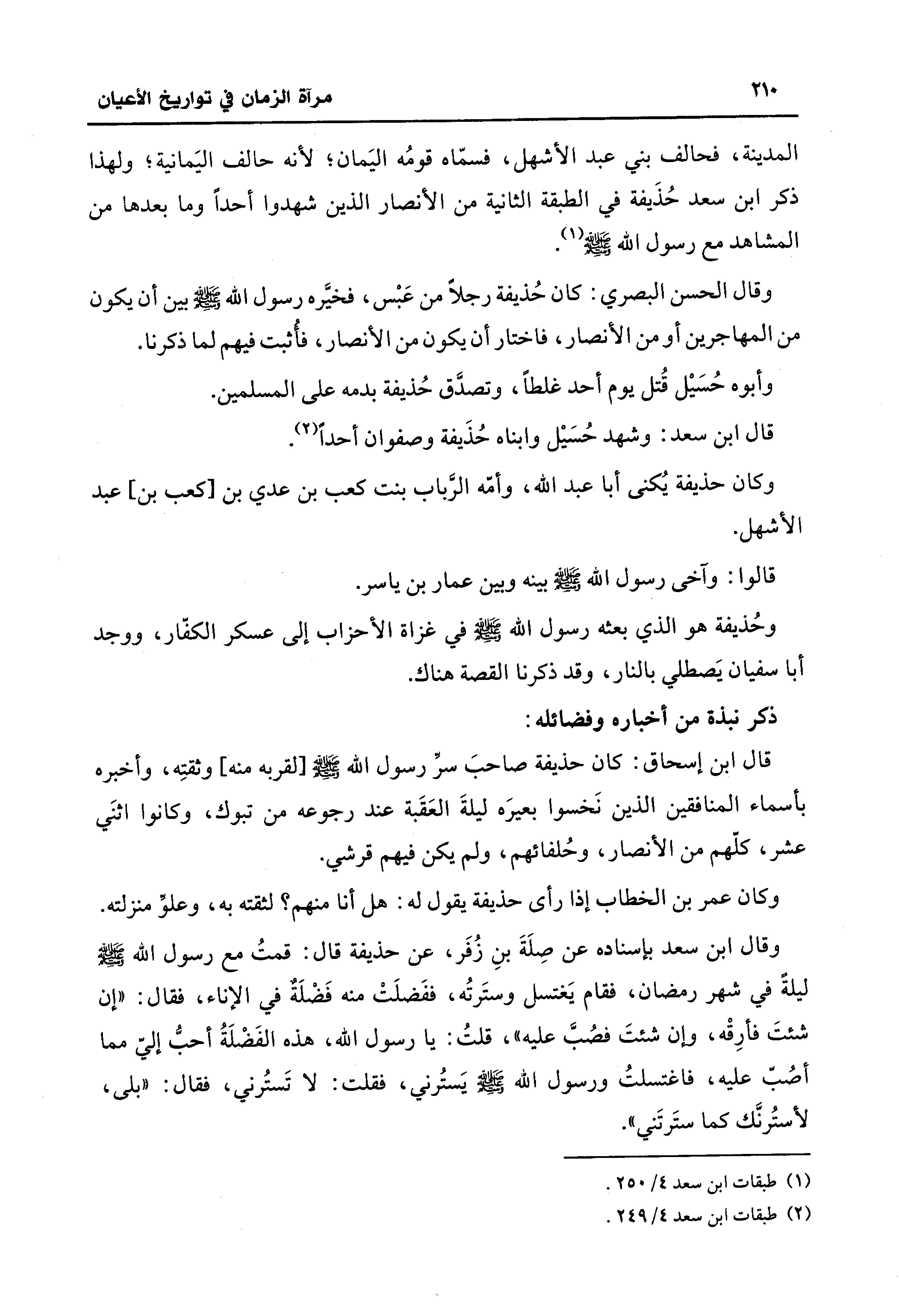 وقال ابن سعد بإسناده عن صِلَةَ بنِ زُفَر، عن حذيفة قال: قمتُ مع رسول الله - صلى الله عليه وسلم - ليلة في شهر رمضان، فقام يَغتسل وستَرتُه، ففَضلَتْ منه فَضْلَةٌ في الإناء، فقال: "إن شئتَ فأرِقْه، وإن شئتَ فصُبَّ عليه"، قلتُ: يا رسول الله، هذه الفَضْلَةُ أحبُّ إليّ مما أصُبّ عليه، فاغتسلتُ ورسول الله - صلى الله عليه وسلم - يَستُرني، فقلت: لا تَستُرني، فقال: "بلى، لأستُرنَّك كما ستَرتَني".