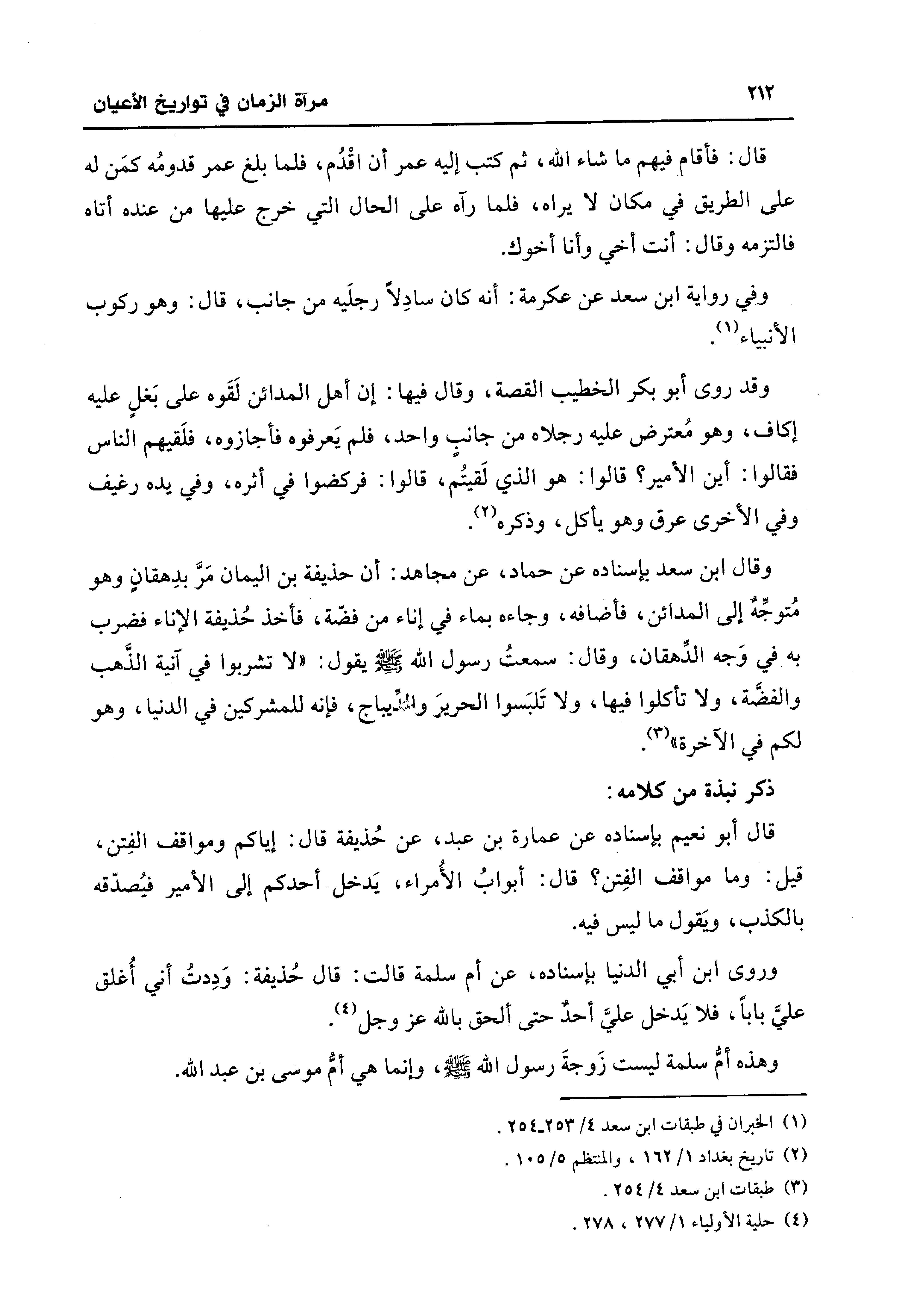 وقال ابن سعد بإسناده عن حماد، عن مجاهد: أن حذيفة بن اليمان مَرَّ بدِهقان وهو مُتوجِّهٌ إلى المدائن، فأضافه، وجاءه بماء في إناء من فضّة، فأخذ حُذيفة الإناء فضرب به في وَجه الدِّهقان، وقال: سمعتُ رسول الله - صلى الله عليه وسلم - يقول: "لا تشربوا في آنية الذَّهب والفضَّة، ولا تأكلوا فيها، ولا تَلبَسوا الحريرَ والديباج، فإنه للمشركين في الدنيا، وهو لكم في الآخرة" (¬3).