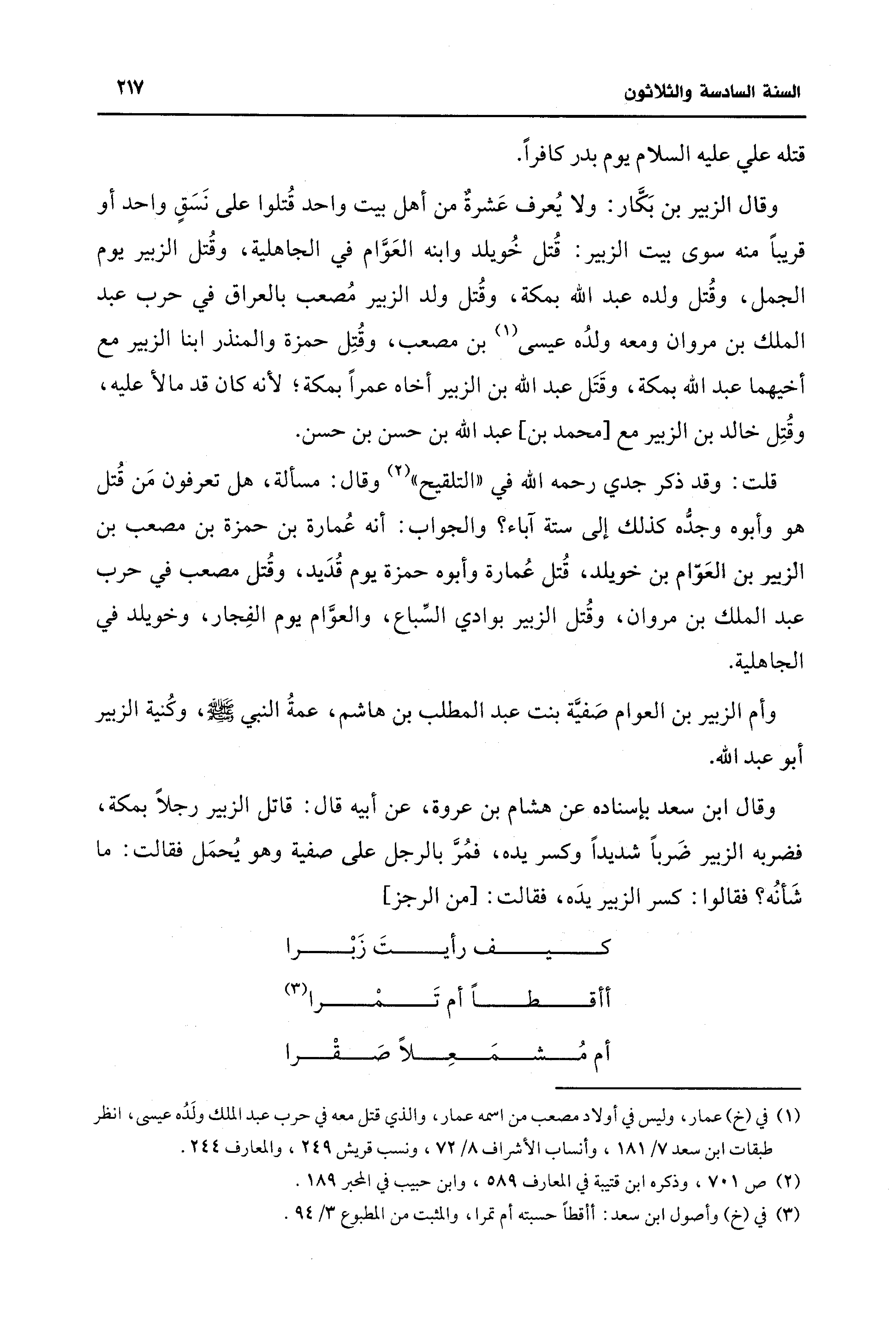 وقال ابن سعد بإسناده عن هشام بن عروة، عن أبيه قال: قاتل الزبير رجلًا بمكة، فضربه الزبير ضَربًا شديدًا وكسر يده، فمُرَّ بالرجل على صفية وهو يُحمَل فقالت: ما شَأنُه؟ فقالوا: كسر الزبير يدَه، فقالت: [من الرجز]