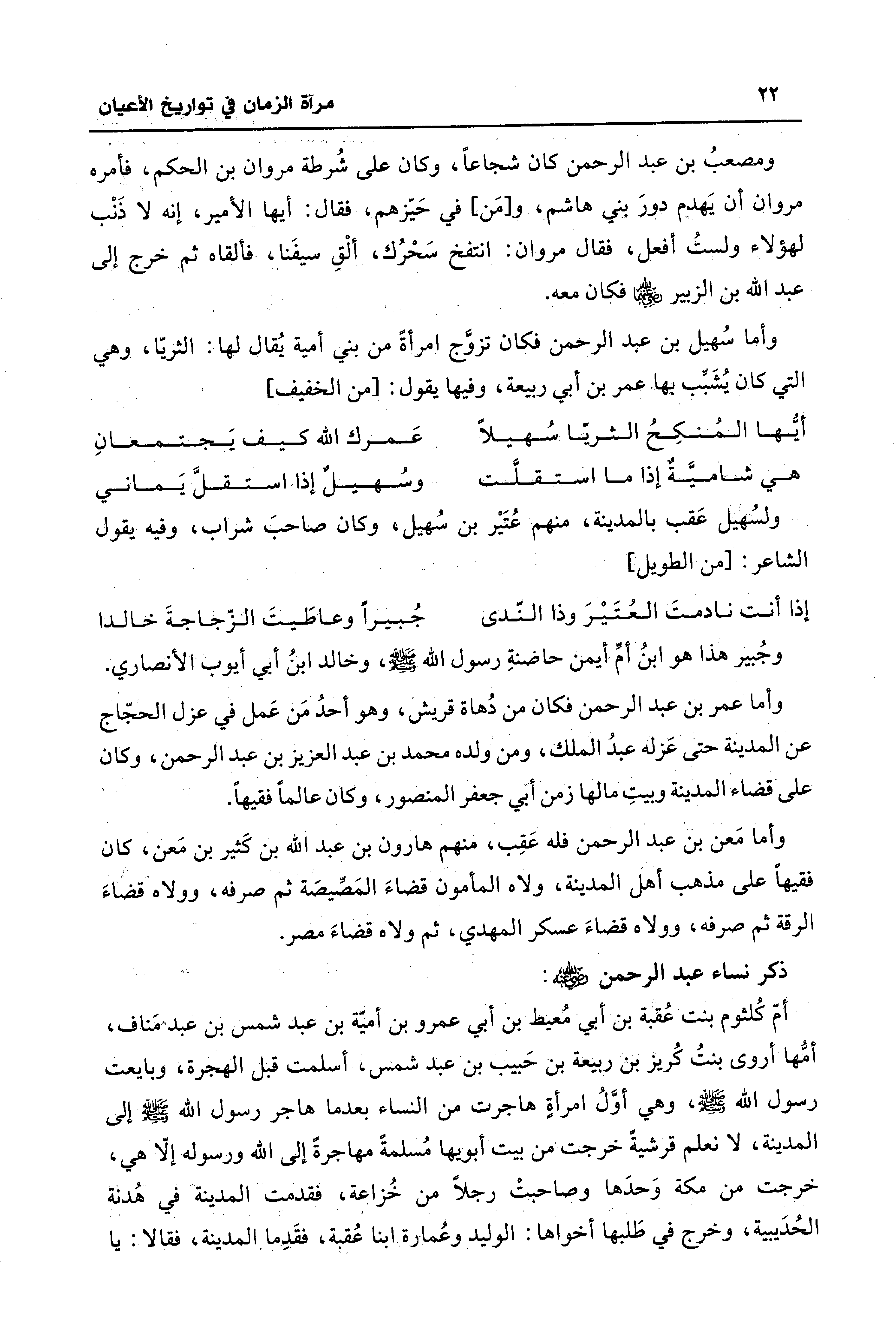 ومصعبُ بن عبد الرحمن كان شجاعًا، وكان على شُرطة مروان بن الحكم، فأمره مروان أن يهدم دورَ بني هاشم، و [مَن] في حَيّزهم، فقال: أيها الأمير، إنه لا ذَنْب لهؤلاء ولستُ أفعل، فقال مروان: انتفخ سَحْرُك، ألْقِ سيفَنا، فألقاه ثم خرج إلى عبد الله بن الزُّبير - رضي الله عنهما - فكان معه.