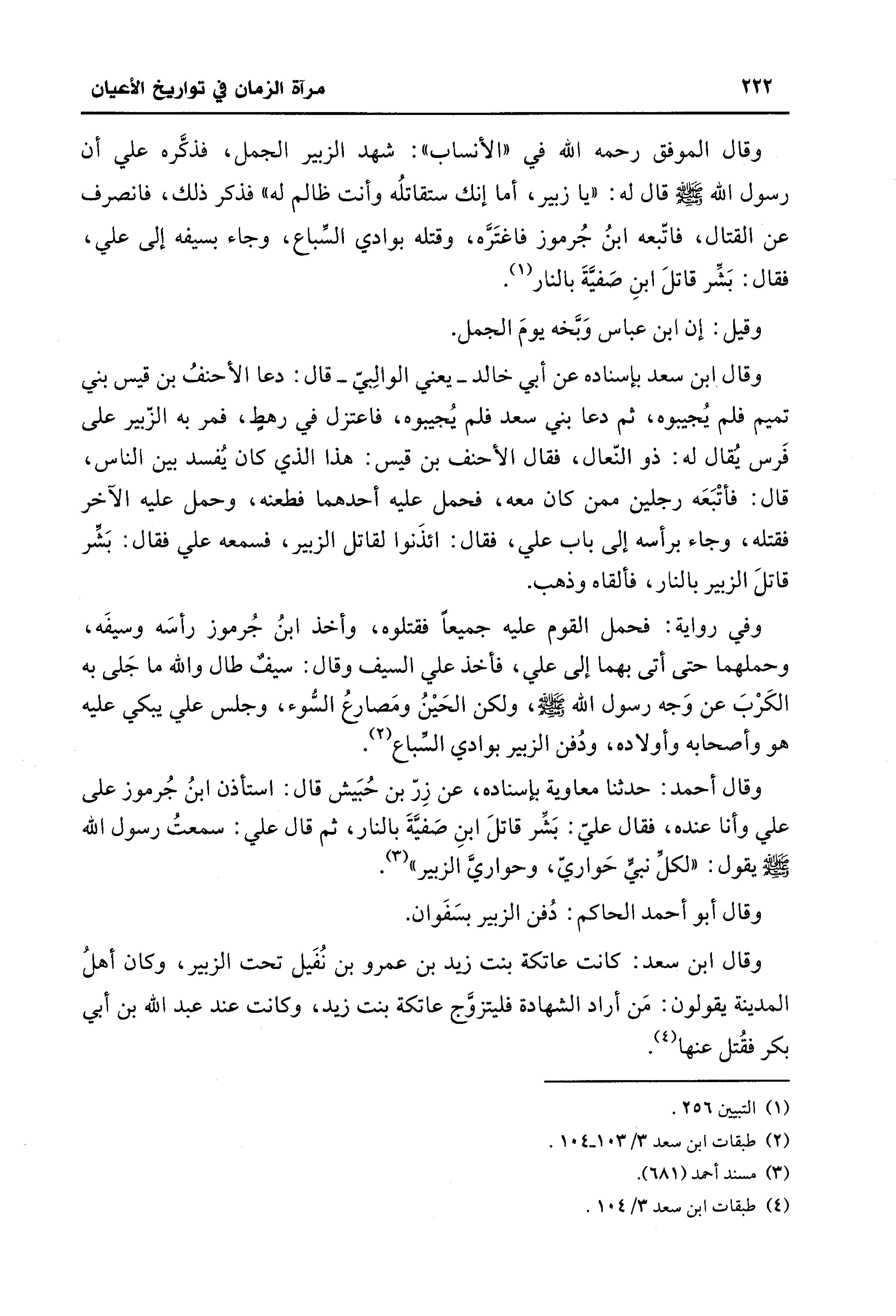 وقال الموفق رحمه الله في "الأنساب": شهد الزبير الجمل، فذكَّره علي أن رسول الله - صلى الله عليه وسلم - قال له: "يا زبير، أما إنك ستقاتلُه وأنت ظالم له" فذكر ذلك، فانصرف عن القتال، فاتّبعه ابنُ جُرموز فاغتَرَّه، وقتله بوادي السِّباع، وجاء بسيفه إلى علي، فقال: بَشِّر قاتلَ ابنِ صَفيَّةَ بالنار (¬1).