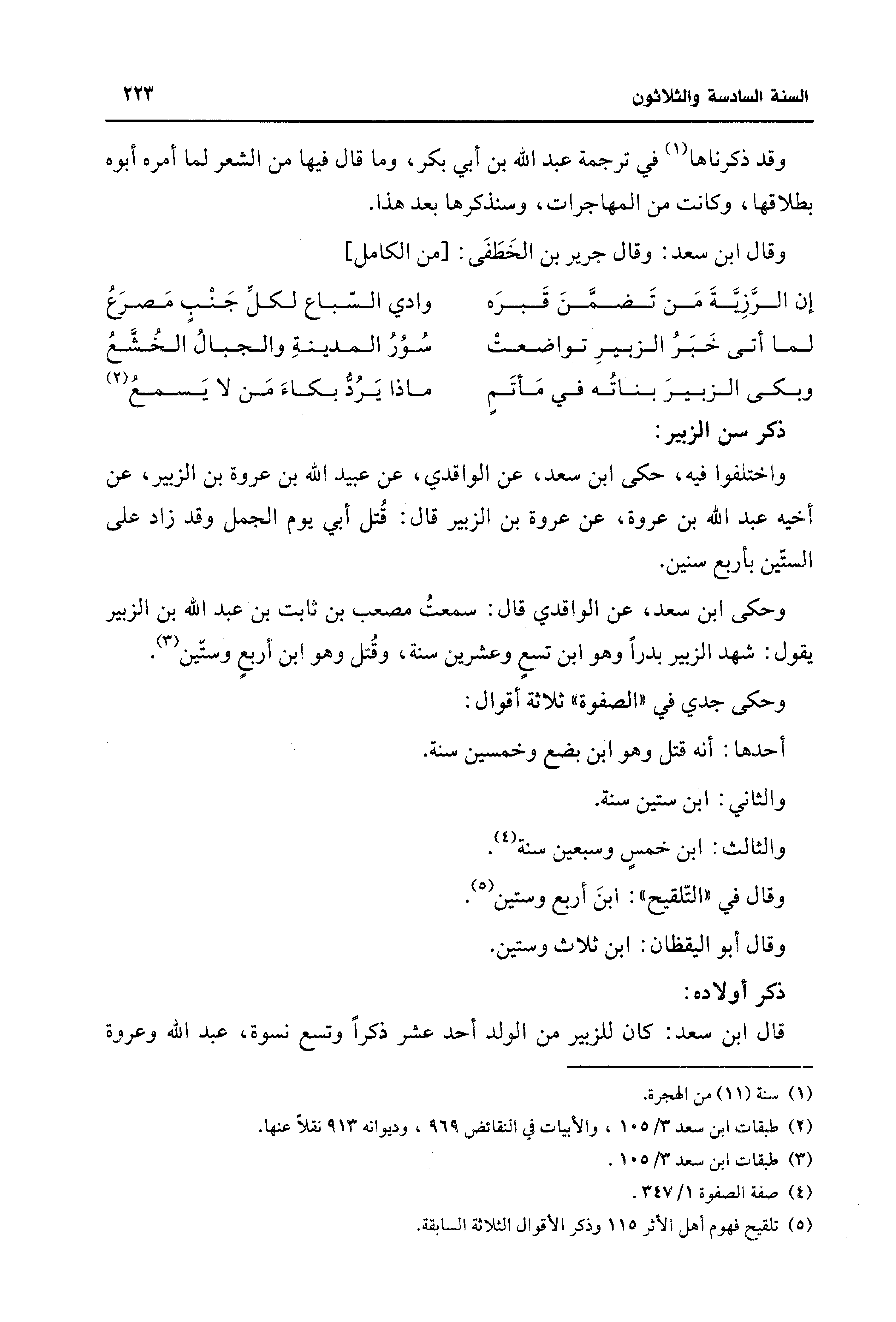 وحكى ابن سعد، عن الواقدي قال: سمعتُ مصعب بن ثابت بن عبد الله بن الزبير يقول: شهد الزبير بدرًا وهو ابن تسعٍ وعشرين سنة، وقُتل وهو ابن أربعٍ وستّين (¬3).