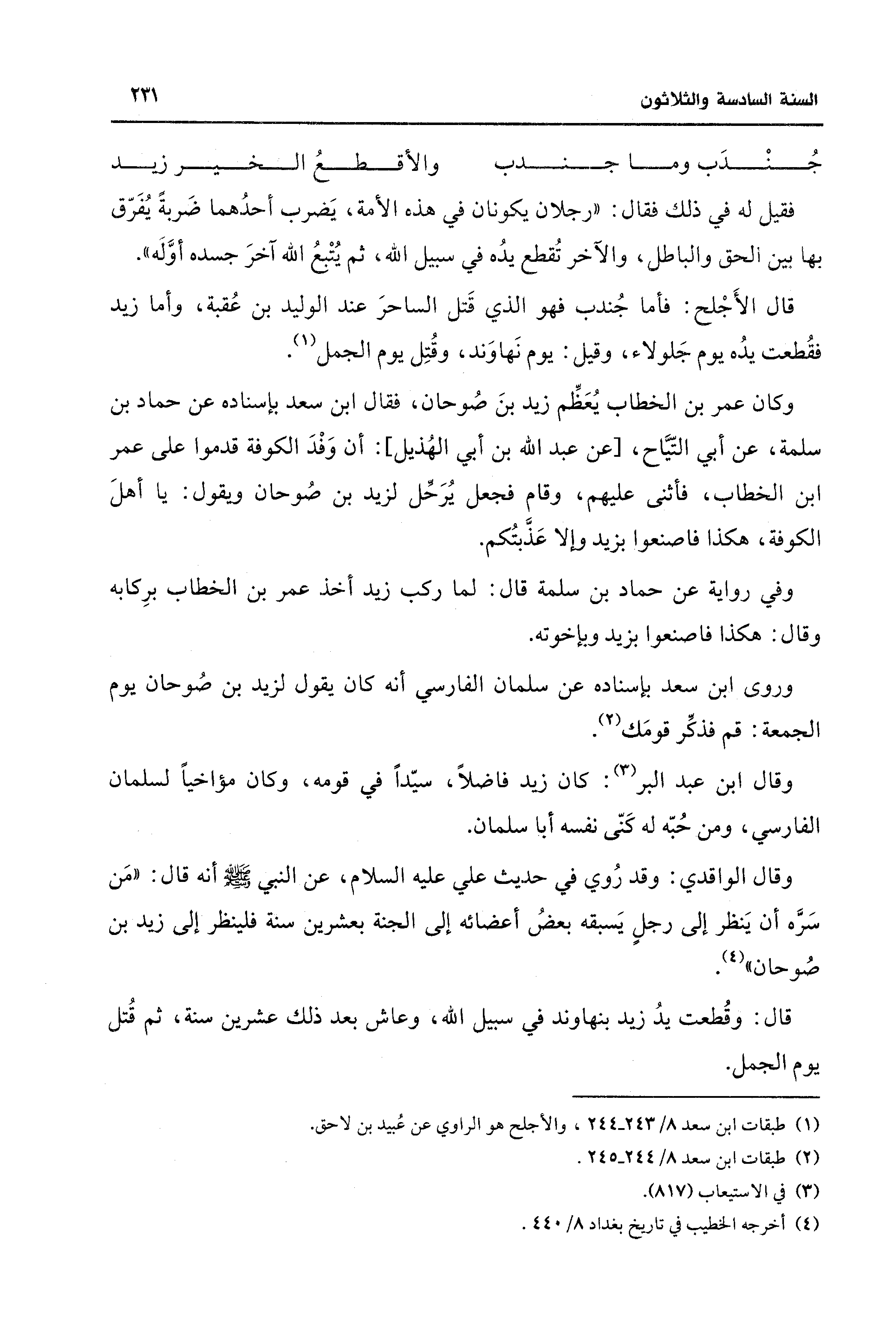 وقال الواقدي: وقد رُوي في حديث علي - عليه السلام -، عن النبي - صلى الله عليه وسلم - أنه قال: "مَن سَرَّه أن يَنظر إلى رجلٍ يَسبقه بعضُ أعضائه إلى الجنة بعشرين سنة فلينظر إلى زيد بن صُوحان" (¬4).