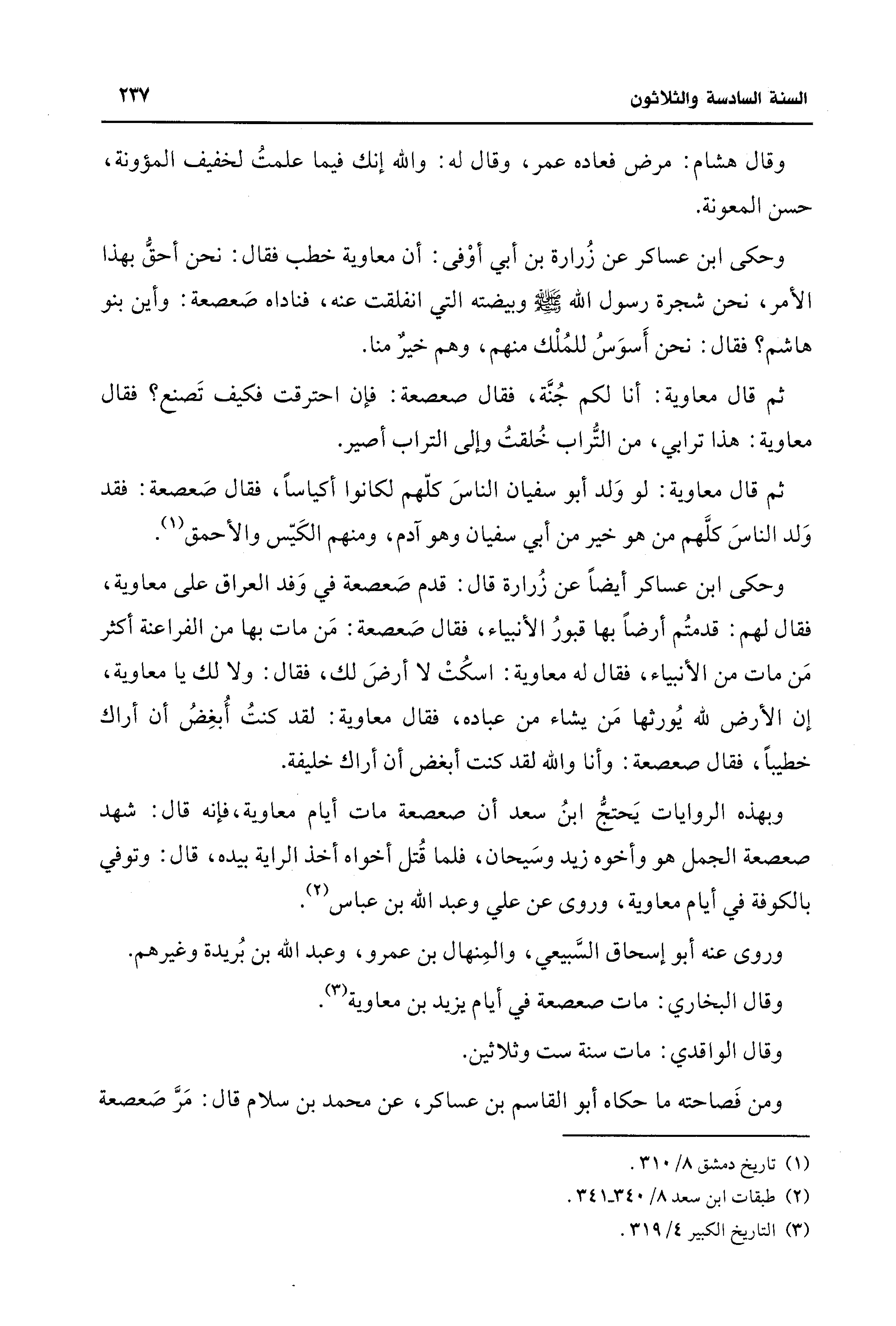 وبهذه الروايات يَحتجُّ ابنُ سعد أن صعصعة مات أيام معاوية، فإنه قال: شهد صعصعة الجمل هو وأخوه زيد وسَيحان، فلما قُتل أخواه أخذ الراية بيده، قال: وتوفي بالكوفة في أيام معاوية، وروى عن علي وعبد الله بن عباس (¬2).