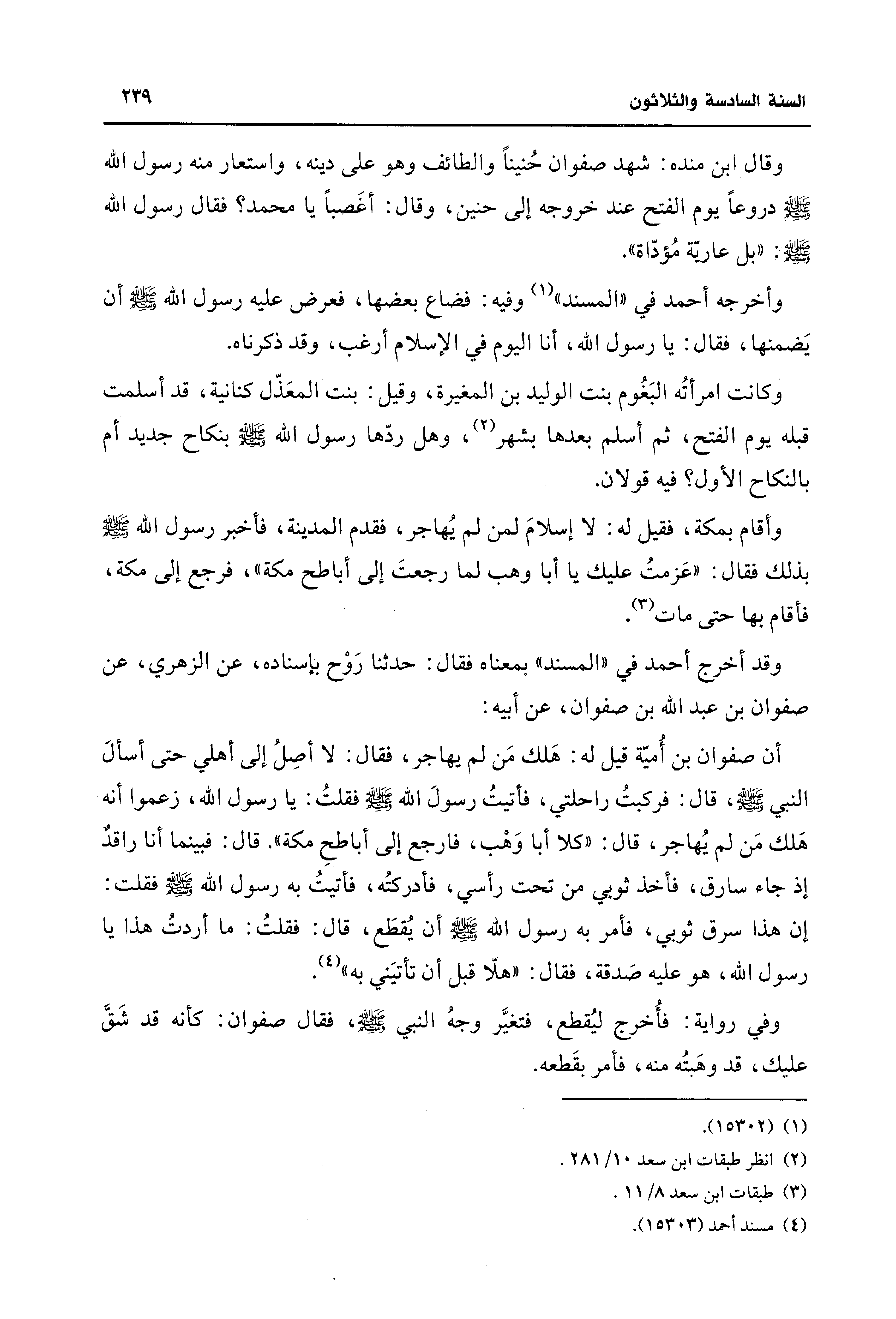 أن صفوان بن أُميّة قيل له: هَلك مَن لم يهاجر، فقال: لا أصِلُ إلى أهلي حتى أسألَ النبي - صلى الله عليه وسلم -، قال: فركبتُ راحلتي، فأتيتُ رسولَ الله - صلى الله عليه وسلم - فقلتُ: يا رسول الله، زعموا أنه هَلك مَن لم يُهاجر، قال: "كلا أبا وَهْب، فارجع إلى أباطحِ مكة". قال: فبينما أنا راقدٌ إذ جاء سارق، فأخذ ثوبي من تحت رأسي، فأدركتُه، فأتيتُ به رسول الله - صلى الله عليه وسلم - فقلت: إن هذا سرق ثوبي، فأمر به رسول الله - صلى الله عليه وسلم - أن يُقطَع، قال: فقلتُ: ما أردتُ هذا يا رسول الله، هو عليه صَدقة، فقال: "هلّا قبل أن تأتيَني به" (¬4).