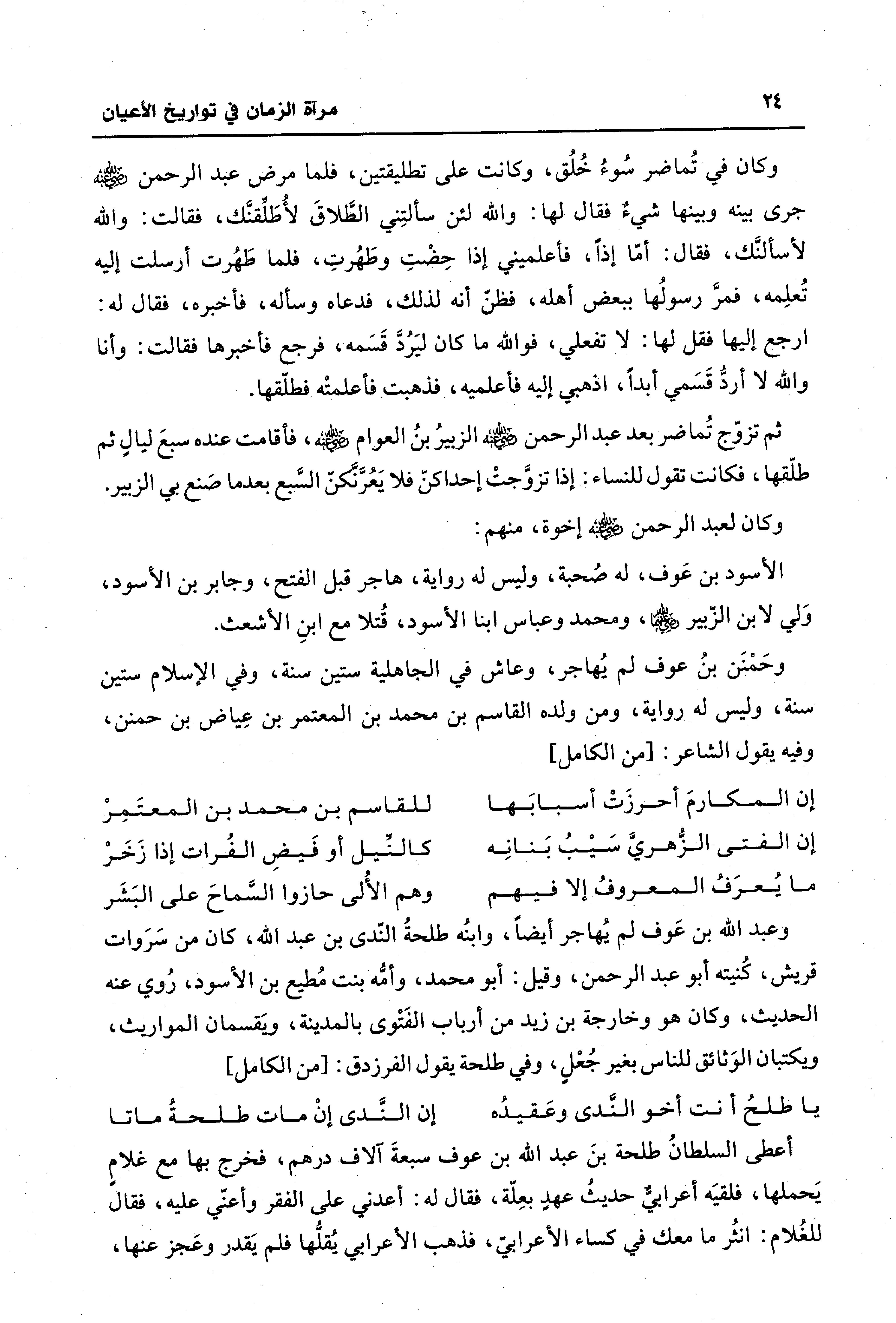 وعبد الله بن عَوف لم يُهاجر أيضًا، وابنُه طلحةُ الندى بن عبد الله، كان من سَرَوات قريش، كُنيته أبو عبد الرحمن، وقيل: أبو محمد، وأمه بنت مُطيع بن الأسود، رُوي عنه الحديث، وكان هو وخارجة بن زيد من أرباب الفَتْوى بالمدينة، ويَقسمان المواريث، ويكتبان الوَثائق للناس بغير جُعْلٍ، وفي طلحة يقول الفرزدق: [من الكامل]